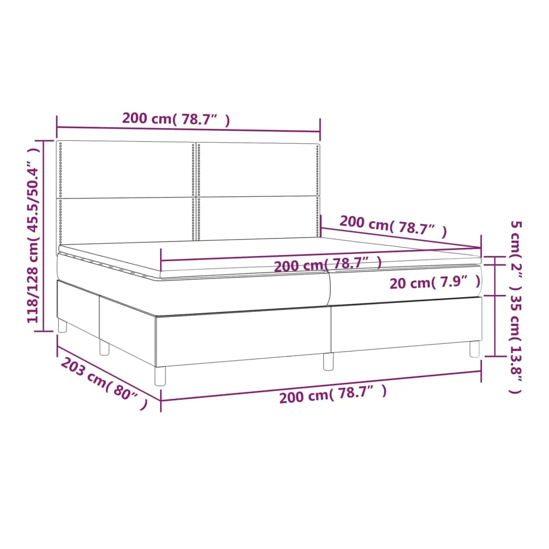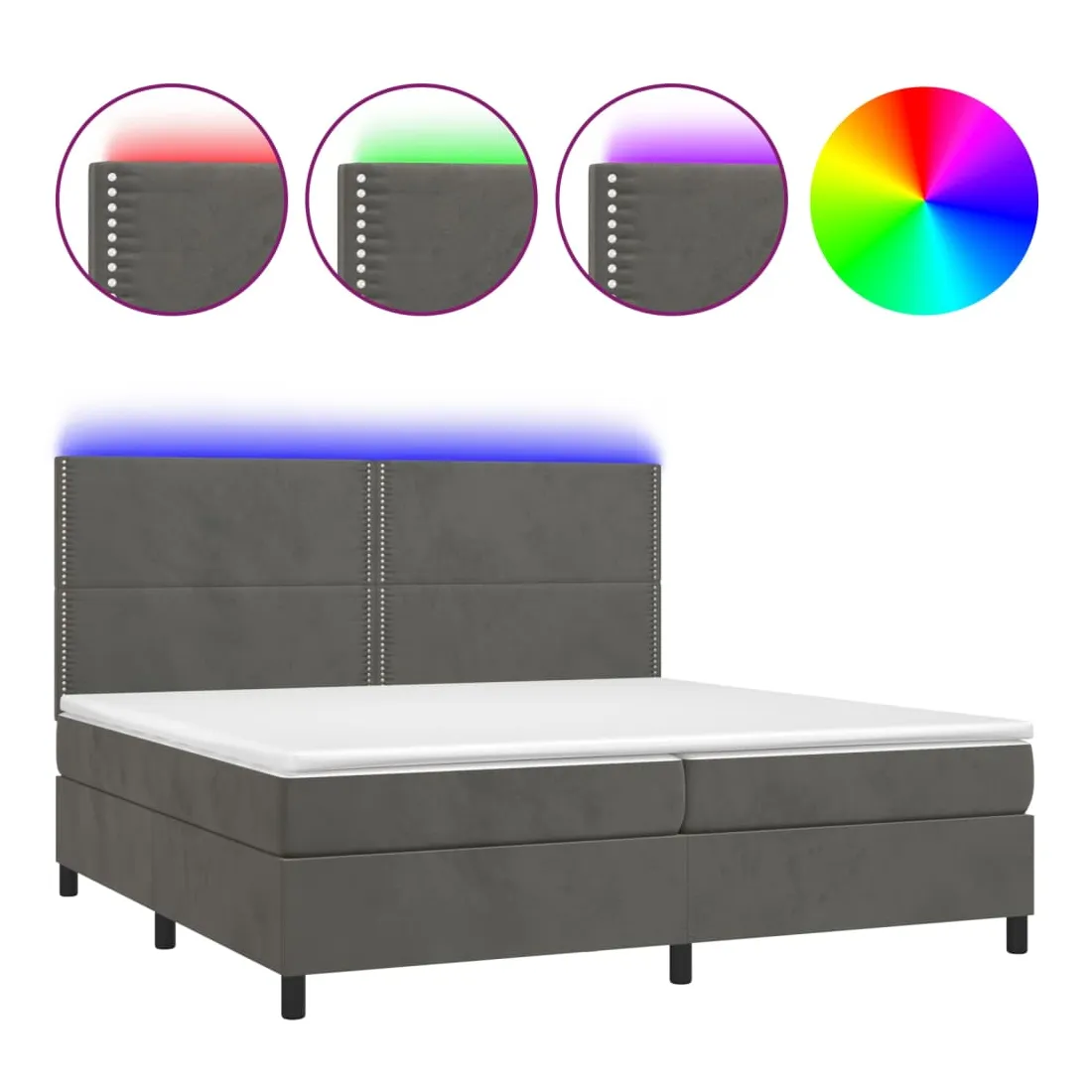Utilisez ce sommier tapissier avec matelas et LED pour profiter d'un sommeil réparateur ! C'est le point central de votre chambre à coucher. Velours doux : le velours est un tissu doux et luxueux qui se reconnaît à son tas dense de fibres uniformément coupées qui ont une touche lisse. Le tissu en velours présente un toucher doux distinctif, ce qui le rend confortable au toucher.Tête de lit pratique : la tête de lit est réglable en hauteur selon vos préférences. La tête de lit vous offre un excellent soutien du dos lorsque vous êtes assis dans votre lit pour lire ou regarder la télévision.Bande LED colorée : apportez de l'éclairage dans l'obscurité avec des lumières LED colorées !Matelas à ressorts ensachés : le ressort ensaché individuel intégré est connu pour sa très haute qualité tout en assurant un haut niveau de durabilité et d'adaptabilité. Il peut absorber efficacement le bruit et les chocs causés par les sauts et les rotations.Protège-matelas doux pour la peau : le protège-matelas est recouvert d'un tissu résistant et doux pour la peau, ce qui le rend souple et confortable. Remarque :Pour des raisons d'hygiène, le matelas ne peut pas être retourné si l'emballage est retiré ou ouvert.Seule la partie avec un symbole de ciseaux peut être coupée et seule la partie avec l'USB continuera à fonctionner comme avant.Chaque produit est livré avec un manuel de montage dans la boîte pour un montage facile.Ce produit est doté d'un connecteur USB, mais la source d'alimentation certifiée de USB 5V n'est pas incluse.
