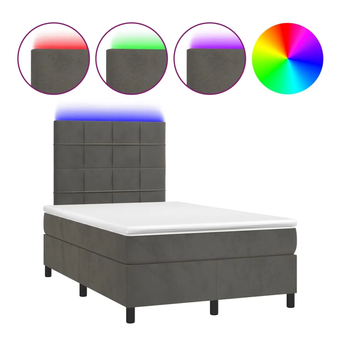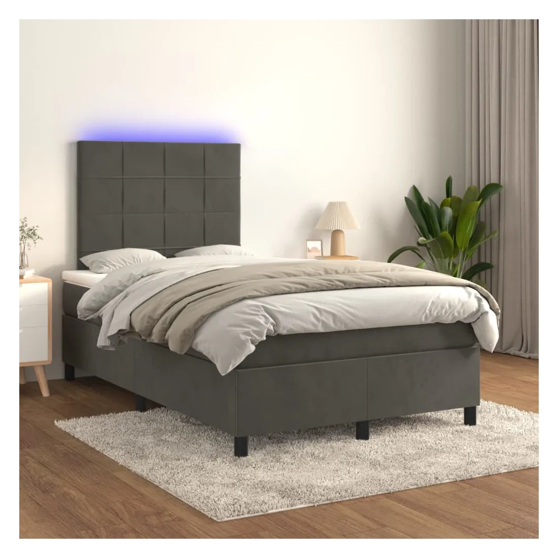 Utilisez ce sommier tapissier avec matelas et LED pour profiter d'un sommeil réparateur ! C'est le point central de votre chambre à coucher. Velours doux : le velours est un tissu doux et luxueux qui se reconnaît à son tas dense de fibres uniformément coupées qui ont une touche lisse. Le tissu en velours présente un toucher doux distinctif, ce qui le rend confortable au toucher.Tête de lit pratique : la tête de lit est réglable en hauteur selon vos préférences. La tête de lit vous offre un excellent soutien du dos lorsque vous êtes assis dans votre lit pour lire ou regarder la télévision.Bande LED colorée : apportez de l'éclairage dans l'obscurité avec des lumières LED colorées !Matelas à ressorts ensachés : le ressort ensaché individuel intégré est connu pour sa très haute qualité tout en assurant un haut niveau de durabilité et d'adaptabilité. Il peut absorber efficacement le bruit et les chocs causés par les sauts et les rotations.Protège-matelas doux pour la peau : le protège-matelas est recouvert d'un tissu résistant et doux pour la peau, ce qui le rend souple et confortable. Remarque :Pour des raisons d'hygiène, le matelas ne peut pas être retourné si l'emballage est retiré ou ouvert.Seule la partie avec un symbole de ciseaux peut être coupée et seule la partie avec l'USB continuera à fonctionner comme avant.Chaque produit est livré avec un manuel de montage dans la boîte pour un montage facile.Ce produit est doté d'un connecteur USB, mais la source d'alimentation certifiée de USB 5V n'est pas incluse.