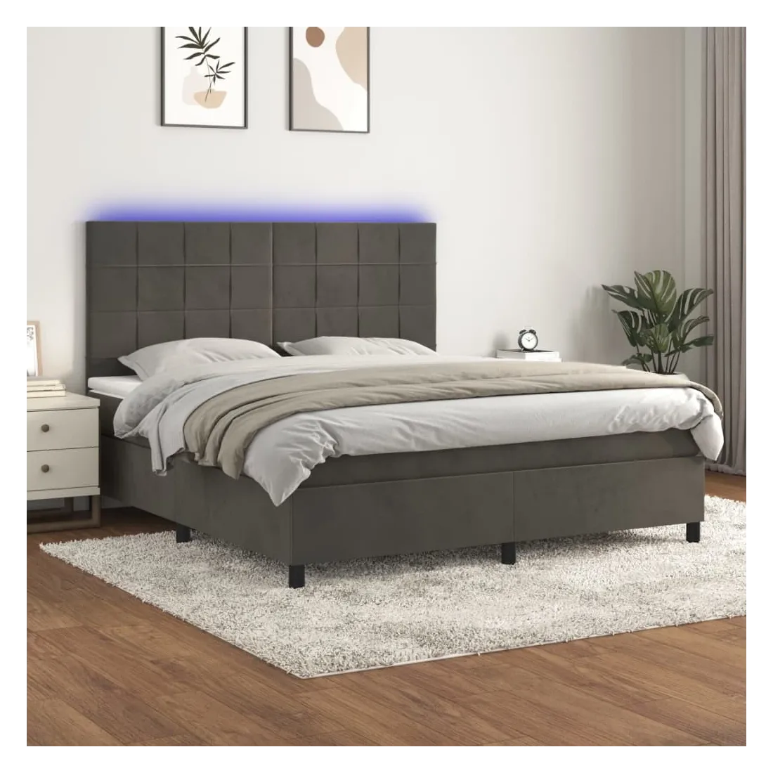 Utilisez ce sommier tapissier avec matelas et LED pour profiter d'un sommeil réparateur ! C'est le point central de votre chambre à coucher. Velours doux : le velours est un tissu doux et luxueux qui se reconnaît à son tas dense de fibres uniformément coupées qui ont une touche lisse. Le tissu en velours présente un toucher doux distinctif, ce qui le rend confortable au toucher.Tête de lit pratique : la tête de lit est réglable en hauteur selon vos préférences. La tête de lit vous offre un excellent soutien du dos lorsque vous êtes assis dans votre lit pour lire ou regarder la télévision.Bande LED colorée : apportez de l'éclairage dans l'obscurité avec des lumières LED colorées !Matelas à ressorts ensachés : le ressort ensaché individuel intégré est connu pour sa très haute qualité tout en assurant un haut niveau de durabilité et d'adaptabilité. Il peut absorber efficacement le bruit et les chocs causés par les sauts et les rotations.Protège-matelas doux pour la peau : le protège-matelas est recouvert d'un tissu résistant et doux pour la peau, ce qui le rend souple et confortable. Remarque :Pour des raisons d'hygiène, le matelas ne peut pas être retourné si l'emballage est retiré ou ouvert.Seule la partie avec un symbole de ciseaux peut être coupée et seule la partie avec l'USB continuera à fonctionner comme avant.Chaque produit est livré avec un manuel de montage dans la boîte pour un montage facile.Ce produit est doté d'un connecteur USB, mais la source d'alimentation certifiée de USB 5V n'est pas incluse.