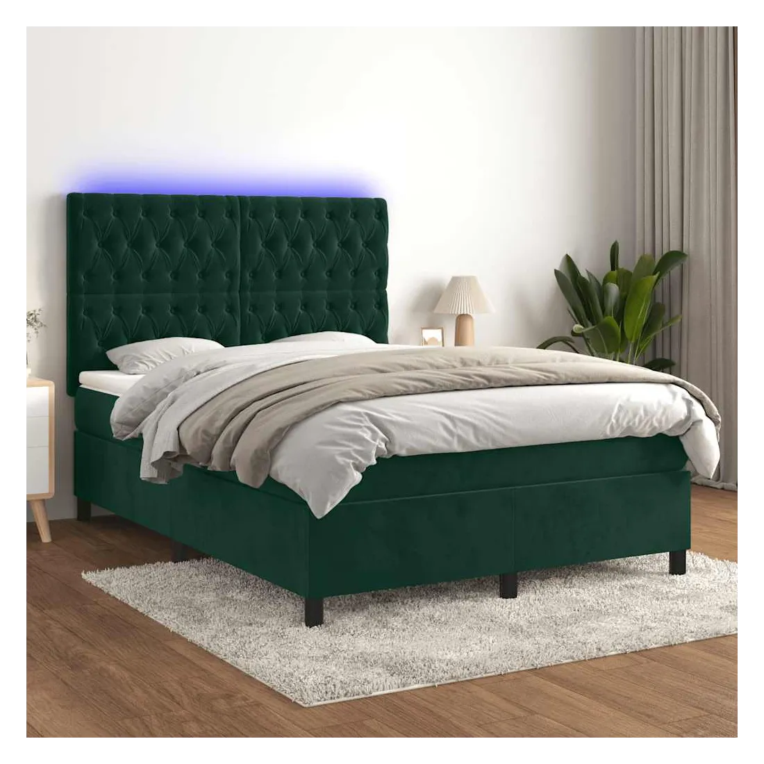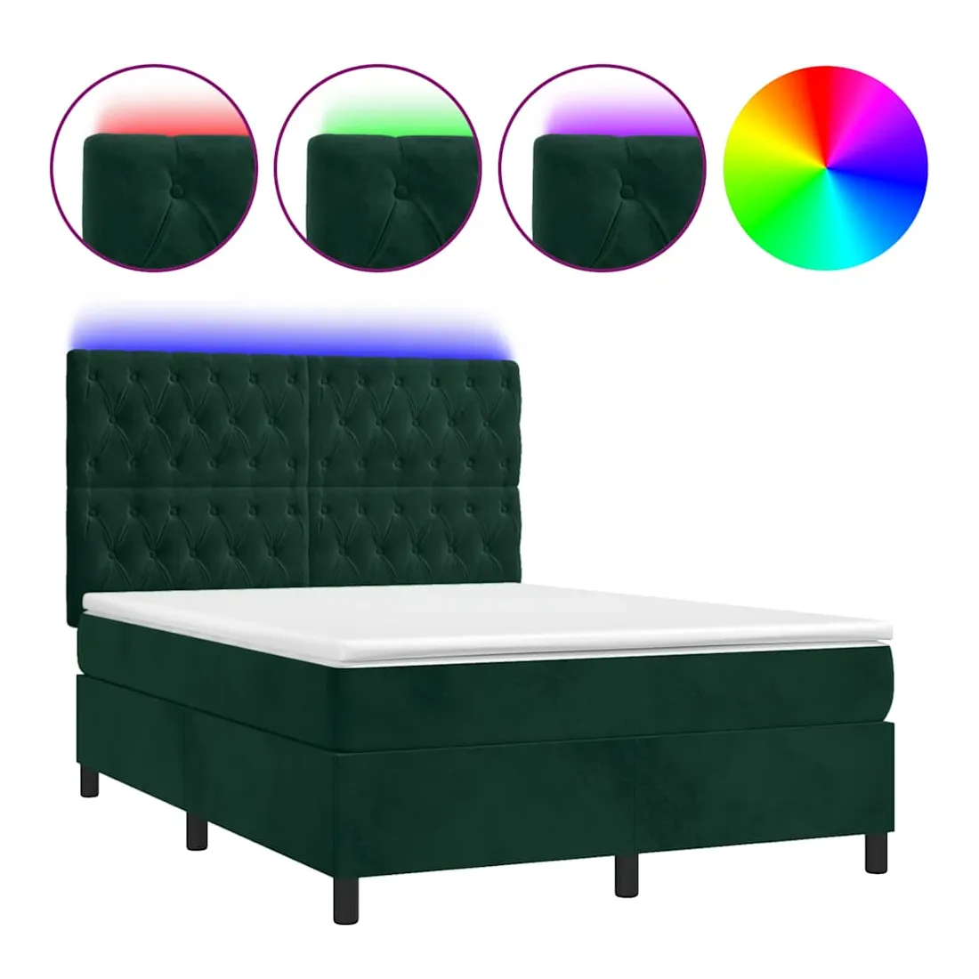Utilisez ce sommier tapissier avec matelas et LED pour profiter d'un sommeil réparateur ! C'est le point central de votre chambre à coucher. Velours doux : le velours est un tissu doux et luxueux qui se reconnaît à son tas dense de fibres uniformément coupées qui ont une touche lisse. Le tissu en velours présente un toucher doux distinctif, ce qui le rend confortable au toucher.Tête de lit pratique : la tête de lit est réglable en hauteur selon vos préférences. La tête de lit vous offre un excellent soutien du dos lorsque vous êtes assis dans votre lit pour lire ou regarder la télévision.Bande LED colorée : apportez de l'éclairage dans l'obscurité avec des lumières LED colorées !Matelas à ressorts ensachés : le ressort ensaché individuel intégré est connu pour sa très haute qualité tout en assurant un haut niveau de durabilité et d'adaptabilité. Il peut absorber efficacement le bruit et les chocs causés par les sauts et les rotations.Protège-matelas doux pour la peau : le protège-matelas est recouvert d'un tissu résistant et doux pour la peau, ce qui le rend souple et confortable. Remarque :Pour des raisons d'hygiène, le matelas ne peut pas être retourné si l'emballage est retiré ou ouvert.Seule la partie avec un symbole de ciseaux peut être coupée et seule la partie avec l'USB continuera à fonctionner comme avant.Chaque produit est livré avec un manuel de montage dans la boîte pour un montage facile.Ce produit est doté d'un connecteur USB, mais la source d'alimentation certifiée de USB 5V n'est pas incluse.