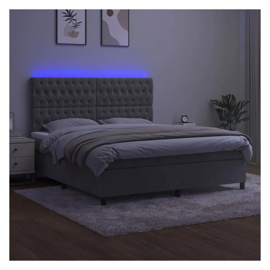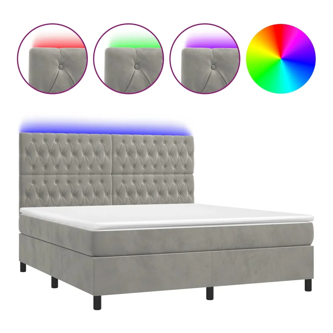 Utilisez ce sommier tapissier avec matelas et LED pour profiter d'un sommeil réparateur ! C'est le point central de votre chambre à coucher. Velours doux : le velours est un tissu doux et luxueux qui se reconnaît à son tas dense de fibres uniformément coupées qui ont une touche lisse. Le tissu en velours présente un toucher doux distinctif, ce qui le rend confortable au toucher.Tête de lit pratique : la tête de lit est réglable en hauteur selon vos préférences. La tête de lit vous offre un excellent soutien du dos lorsque vous êtes assis dans votre lit pour lire ou regarder la télévision.Bande LED colorée : apportez de l'éclairage dans l'obscurité avec des lumières LED colorées !Matelas à ressorts ensachés : le ressort ensaché individuel intégré est connu pour sa très haute qualité tout en assurant un haut niveau de durabilité et d'adaptabilité. Il peut absorber efficacement le bruit et les chocs causés par les sauts et les rotations.Protège-matelas doux pour la peau : le protège-matelas est recouvert d'un tissu résistant et doux pour la peau, ce qui le rend souple et confortable. Remarque :Pour des raisons d'hygiène, le matelas ne peut pas être retourné si l'emballage est retiré ou ouvert.Seule la partie avec un symbole de ciseaux peut être coupée et seule la partie avec l'USB continuera à fonctionner comme avant.Chaque produit est livré avec un manuel de montage dans la boîte pour un montage facile.Ce produit est doté d'un connecteur USB, mais la source d'alimentation certifiée de USB 5V n'est pas incluse.