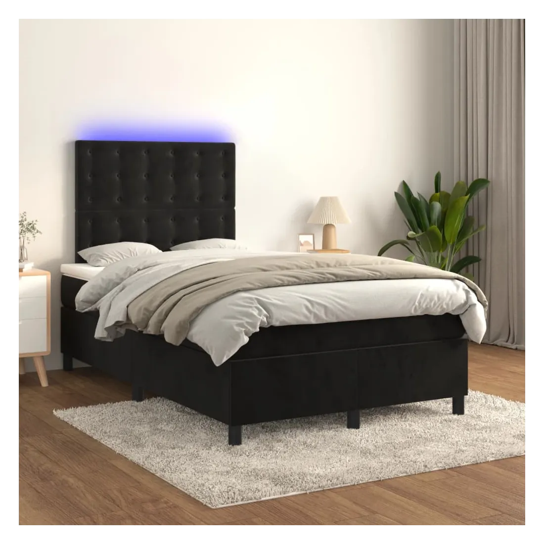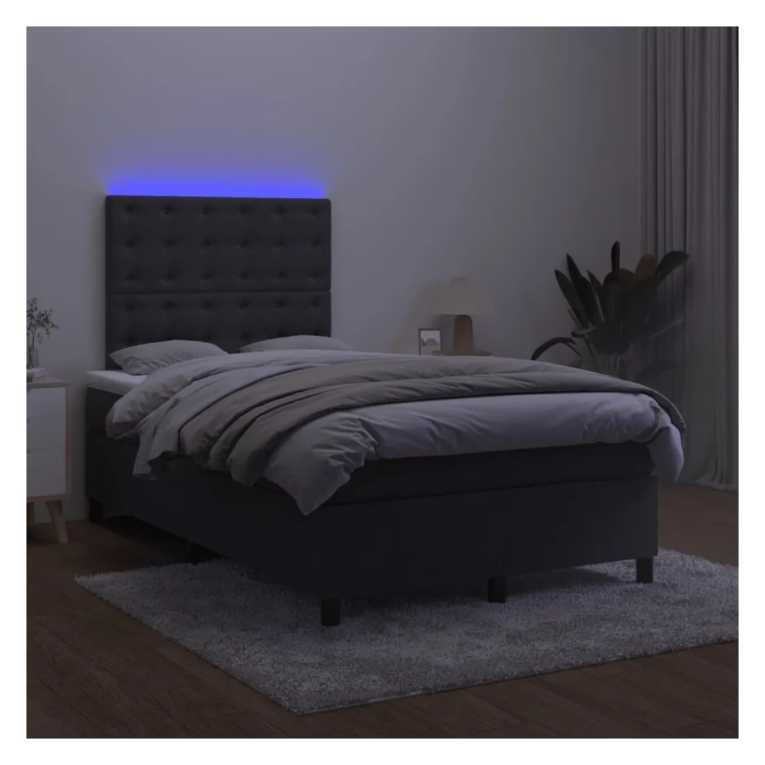 Utilisez ce sommier tapissier avec matelas et LED pour profiter d'un sommeil réparateur ! C'est le point central de votre chambre à coucher. Velours doux : le velours est un tissu doux et luxueux qui se reconnaît à son tas dense de fibres uniformément coupées qui ont une touche lisse. Le tissu en velours présente un toucher doux distinctif, ce qui le rend confortable au toucher.Tête de lit pratique : la tête de lit est réglable en hauteur selon vos préférences. La tête de lit vous offre un excellent soutien du dos lorsque vous êtes assis dans votre lit pour lire ou regarder la télévision.Bande LED colorée : apportez de l'éclairage dans l'obscurité avec des lumières LED colorées !Matelas à ressorts ensachés : le ressort ensaché individuel intégré est connu pour sa très haute qualité tout en assurant un haut niveau de durabilité et d'adaptabilité. Il peut absorber efficacement le bruit et les chocs causés par les sauts et les rotations.Protège-matelas doux pour la peau : le protège-matelas est recouvert d'un tissu résistant et doux pour la peau, ce qui le rend souple et confortable. Remarque :Pour des raisons d'hygiène, le matelas ne peut pas être retourné si l'emballage est retiré ou ouvert.Seule la partie avec un symbole de ciseaux peut être coupée et seule la partie avec l'USB continuera à fonctionner comme avant.Chaque produit est livré avec un manuel de montage dans la boîte pour un montage facile.Ce produit est doté d'un connecteur USB, mais la source d'alimentation certifiée de USB 5V n'est pas incluse.