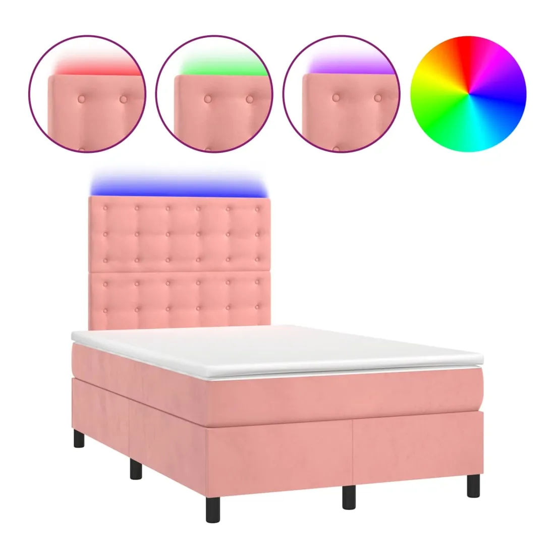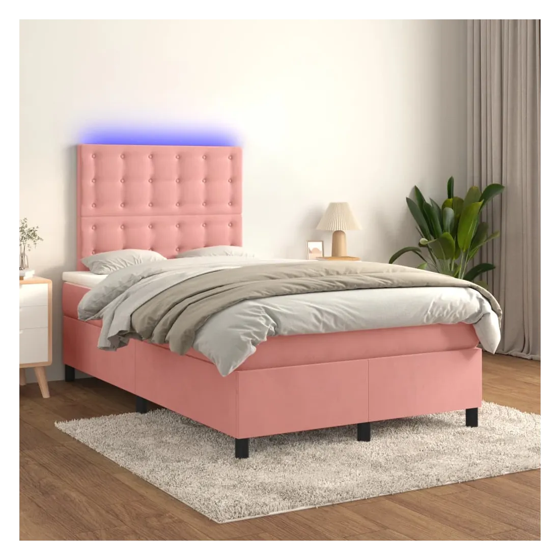 Utilisez ce sommier tapissier avec matelas et LED pour profiter d'un sommeil réparateur ! C'est le point central de votre chambre à coucher. Velours doux : le velours est un tissu doux et luxueux qui se reconnaît à son tas dense de fibres uniformément coupées qui ont une touche lisse. Le tissu en velours présente un toucher doux distinctif, ce qui le rend confortable au toucher.Tête de lit pratique : la tête de lit est réglable en hauteur selon vos préférences. La tête de lit vous offre un excellent soutien du dos lorsque vous êtes assis dans votre lit pour lire ou regarder la télévision.Bande LED colorée : apportez de l'éclairage dans l'obscurité avec des lumières LED colorées !Matelas à ressorts ensachés : le ressort ensaché individuel intégré est connu pour sa très haute qualité tout en assurant un haut niveau de durabilité et d'adaptabilité. Il peut absorber efficacement le bruit et les chocs causés par les sauts et les rotations.Protège-matelas doux pour la peau : le protège-matelas est recouvert d'un tissu résistant et doux pour la peau, ce qui le rend souple et confortable. Remarque :Pour des raisons d'hygiène, le matelas ne peut pas être retourné si l'emballage est retiré ou ouvert.Seule la partie avec un symbole de ciseaux peut être coupée et seule la partie avec l'USB continuera à fonctionner comme avant.Chaque produit est livré avec un manuel de montage dans la boîte pour un montage facile.Ce produit est doté d'un connecteur USB, mais la source d'alimentation certifiée de USB 5V n'est pas incluse.
