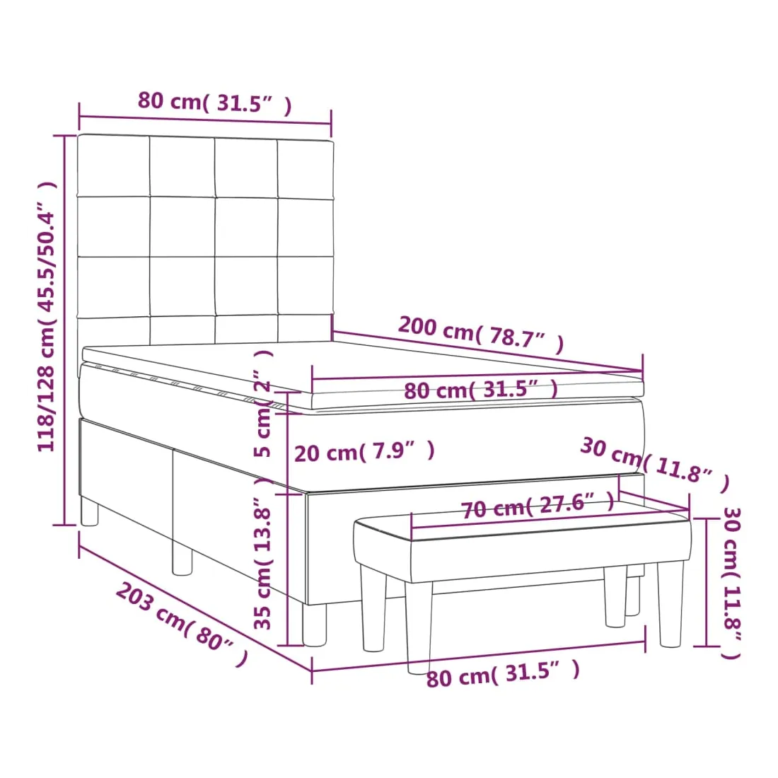 • Dimensions: 203 x 80 x 118/128 cm (L x l x H)