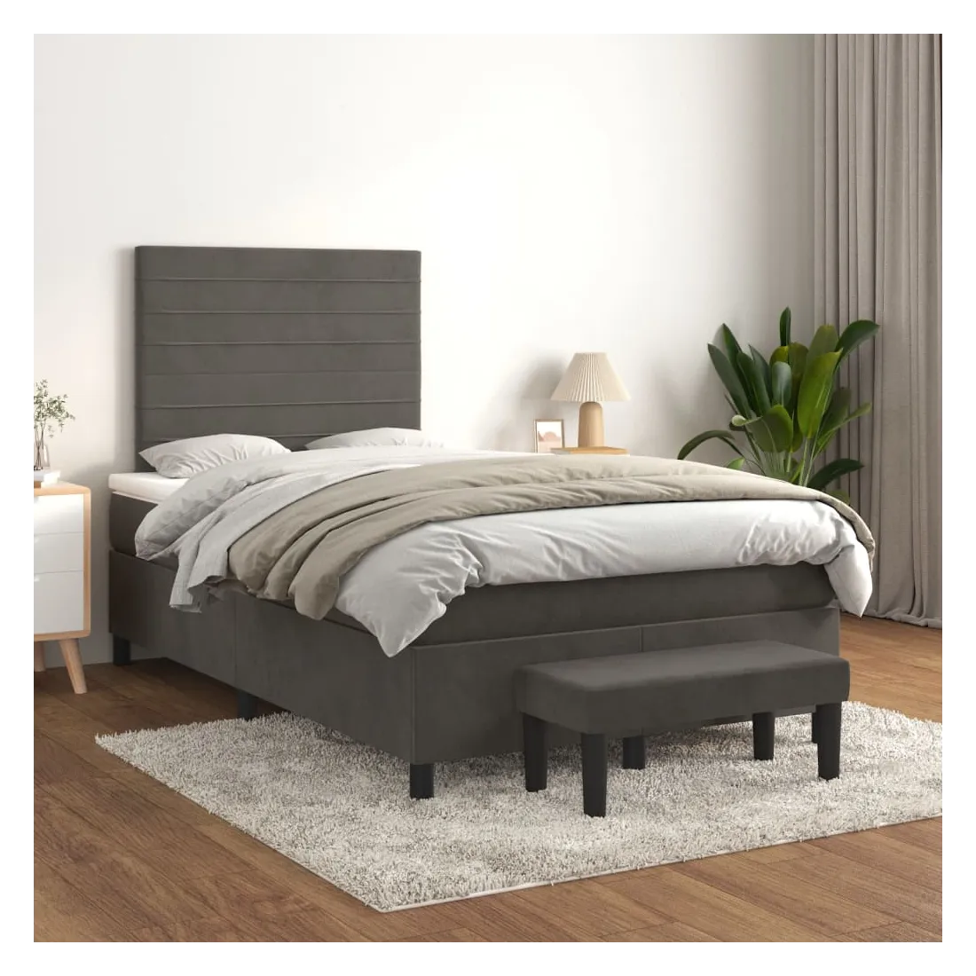 Utilisez ce lit à sommier pour profiter d'une nuit de sommeil réparatrice ! Il vous offre une relaxation maximale et un sommeil agréable. Velours doux : le velours est un tissu doux et luxueux qui se reconnaît à son tas dense de fibres uniformément coupées qui ont une touche lisse. Le tissu en velours présente un toucher doux distinctif, ce qui le rend confortable au toucher.Tête de lit pratique : la tête de lit est réglable en hauteur selon vos préférences. La tête de lit vous offre un excellent soutien du dos lorsque vous êtes assis dans votre lit pour lire ou regarder la télévision.Matelas à ressorts ensachés : le ressort ensaché individuel intégré est connu pour sa très haute qualité tout en assurant un haut niveau de durabilité et d'adaptabilité. Il peut absorber efficacement le bruit et les chocs causés par les sauts et les rotations.Support moyen-dur : ce matelas de lit offre une stabilité accrue et juste le niveau de fermeté sans sacrifier le confort. Il est donc idéal pour les personnes qui dorment sur le dos ou sur le ventre.Protège-matelas doux pour la peau : le protège-matelas est recouvert d'un tissu résistant et doux pour la peau, ce qui le rend souple et confortable.Banc multifonctionnel : ce banc peut servir de siège supplémentaire dans votre maison. Il peut également être utilisé comme banc de bout de lit. Remarque :Pour des raisons d'hygiène, le matelas ne peut pas être retourné si l'emballage est retiré ou ouvert.Chaque produit est livré avec un manuel de montage dans la boîte pour un montage facile.