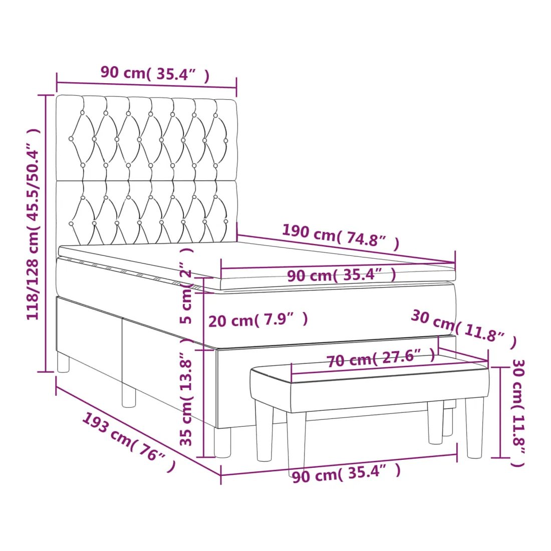 Utilisez ce lit à sommier pour profiter d'une nuit de sommeil réparatrice ! Il vous offre une relaxation maximale et un sommeil agréable. Velours doux : le velours est un tissu doux et luxueux qui se reconnaît à son tas dense de fibres uniformément coupées qui ont une touche lisse. Le tissu en velours présente un toucher doux distinctif, ce qui le rend confortable au toucher.Tête de lit pratique : la tête de lit est réglable en hauteur selon vos préférences. La tête de lit vous offre un excellent soutien du dos lorsque vous êtes assis dans votre lit pour lire ou regarder la télévision.Matelas à ressorts ensachés : le ressort ensaché individuel intégré est connu pour sa très haute qualité tout en assurant un haut niveau de durabilité et d'adaptabilité. Il peut absorber efficacement le bruit et les chocs causés par les sauts et les rotations.Support moyen-dur : ce matelas de lit offre une stabilité accrue et juste le niveau de fermeté sans sacrifier le confort. Il est donc idéal pour les personnes qui dorment sur le dos ou sur le ventre.Protège-matelas doux pour la peau : le protège-matelas est recouvert d'un tissu résistant et doux pour la peau, ce qui le rend souple et confortable.Banc multifonctionnel : ce banc peut servir de siège supplémentaire dans votre maison. Il peut également être utilisé comme banc de bout de lit. Remarque :Pour des raisons d'hygiène, le matelas ne peut pas être retourné si l'emballage est retiré ou ouvert.Chaque produit est livré avec un manuel de montage dans la boîte pour un montage facile.