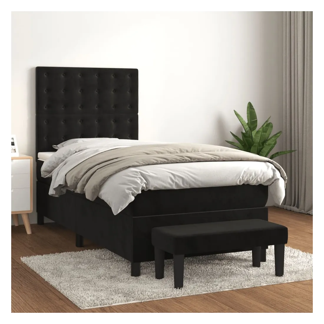 Utilisez ce lit à sommier pour profiter d'une nuit de sommeil réparatrice ! Il vous offre une relaxation maximale et un sommeil agréable. Velours doux : le velours est un tissu doux et luxueux qui se reconnaît à son tas dense de fibres uniformément coupées qui ont une touche lisse. Le tissu en velours présente un toucher doux distinctif, ce qui le rend confortable au toucher.Tête de lit pratique : la tête de lit est réglable en hauteur selon vos préférences. La tête de lit vous offre un excellent soutien du dos lorsque vous êtes assis dans votre lit pour lire ou regarder la télévision.Matelas à ressorts ensachés : le ressort ensaché individuel intégré est connu pour sa très haute qualité tout en assurant un haut niveau de durabilité et d'adaptabilité. Il peut absorber efficacement le bruit et les chocs causés par les sauts et les rotations.Support moyen-dur : ce matelas de lit offre une stabilité accrue et juste le niveau de fermeté sans sacrifier le confort. Il est donc idéal pour les personnes qui dorment sur le dos ou sur le ventre.Protège-matelas doux pour la peau : le protège-matelas est recouvert d'un tissu résistant et doux pour la peau, ce qui le rend souple et confortable.Banc multifonctionnel : ce banc peut servir de siège supplémentaire dans votre maison. Il peut également être utilisé comme banc de bout de lit. Remarque :Pour des raisons d'hygiène, le matelas ne peut pas être retourné si l'emballage est retiré ou ouvert.Chaque produit est livré avec un manuel de montage dans la boîte pour un montage facile.