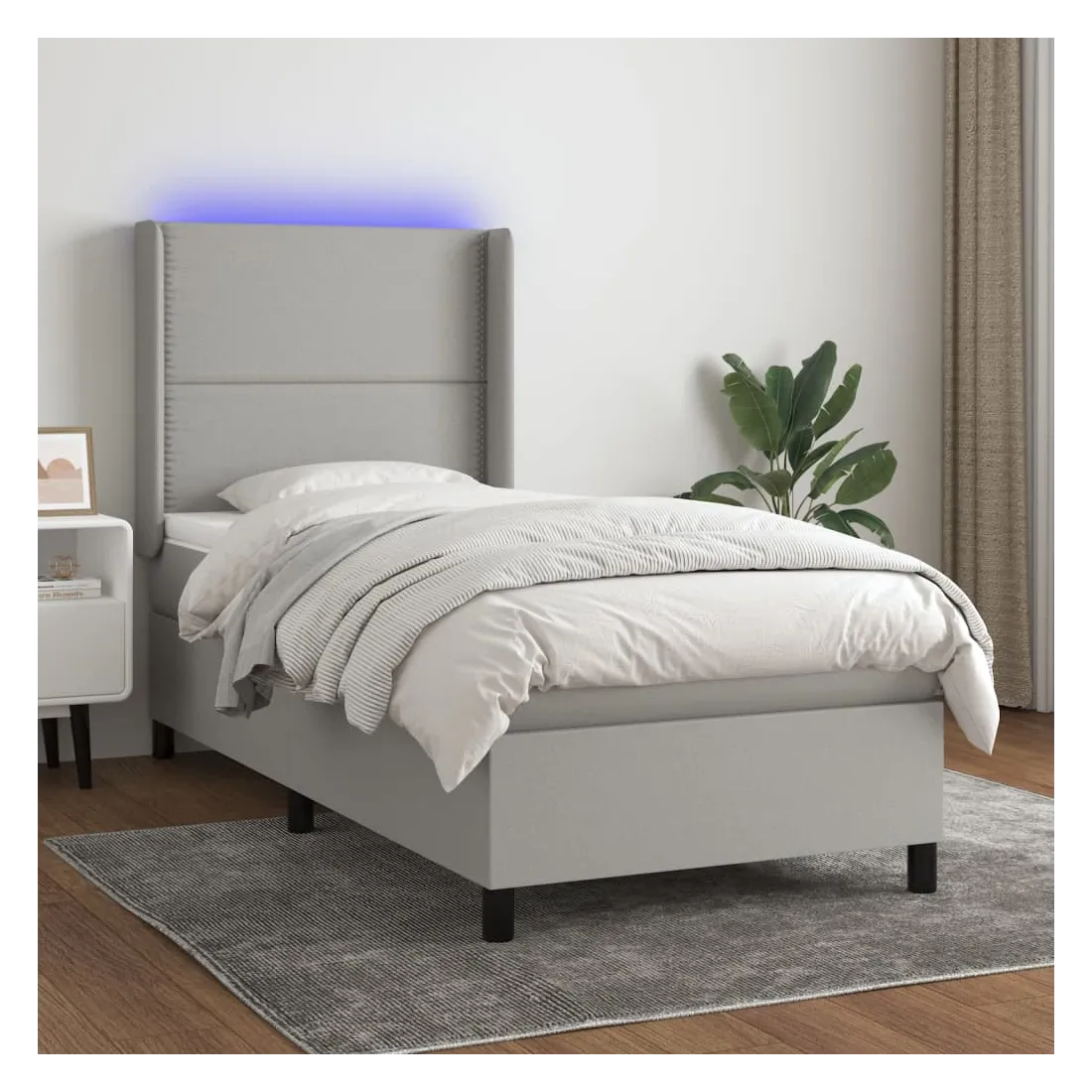 Utilisez ce sommier tapissier avec matelas et LED pour profiter d'un sommeil réparateur ! C'est le point central de votre chambre à coucher. Tissu durable : le tissu présente un aspect simple et épuré, et il est respirant et durable. Tête de lit pratique : la tête de lit est réglable en hauteur selon vos préférences. La tête de lit vous offre un excellent soutien du dos lorsque vous êtes assis dans votre lit pour lire ou regarder la télévision. Bande LED colorée : apportez de l'éclairage dans l'obscurité avec des lumières LED colorées ! Matelas à ressorts ensachés : le ressort ensaché individuel intégré est connu pour sa très haute qualité tout en assurant un haut niveau de durabilité et d'adaptabilité. Il peut absorber efficacement le bruit et les chocs causés par les sauts et les rot