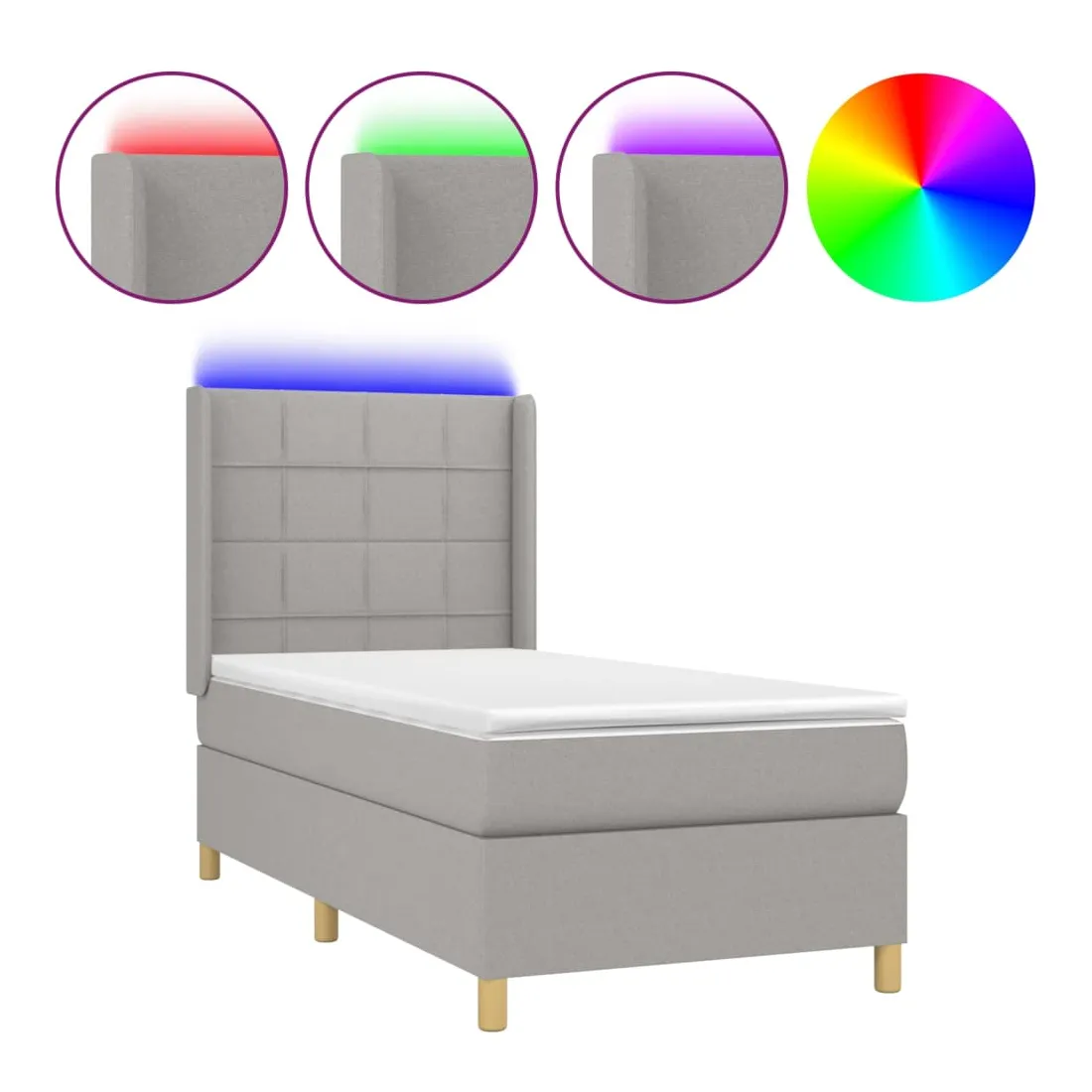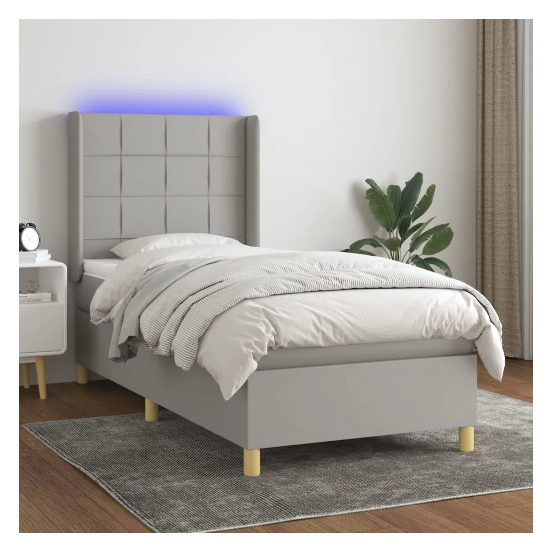 Utilisez ce sommier tapissier avec matelas et LED pour profiter d'un sommeil réparateur ! C'est le point central de votre chambre à coucher. Tissu durable : le tissu présente un aspect simple et épuré, et il est respirant et durable.Tête de lit pratique : la tête de lit est réglable en hauteur selon vos préférences. La tête de lit vous offre un excellent soutien du dos lorsque vous êtes assis dans votre lit pour lire ou regarder la télévision.Bande LED colorée : apportez de l'éclairage dans l'obscurité avec des lumières LED colorées !Matelas à ressorts ensachés : le ressort ensaché individuel intégré est connu pour sa très haute qualité tout en assurant un haut niveau de durabilité et d'adaptabilité. Il peut absorber efficacement le bruit et les chocs causés par les sauts et les rotations.Protège-matelas doux pour la peau : le protège-matelas est recouvert d'un tissu résistant et doux pour la peau, ce qui le rend souple et confortable. Remarque :Pour des raisons d'hygiène, le matelas ne peut pas être retourné si l'emballage est retiré ou ouvert.Seule la partie avec un symbole de ciseaux peut être coupée et seule la partie avec l'USB continuera à fonctionner comme avant.Chaque produit est livré avec un manuel de montage dans la boîte pour un montage facile.Ce produit est doté d'un connecteur USB, mais la source d'alimentation certifiée de USB 5V n'est pas incluse.