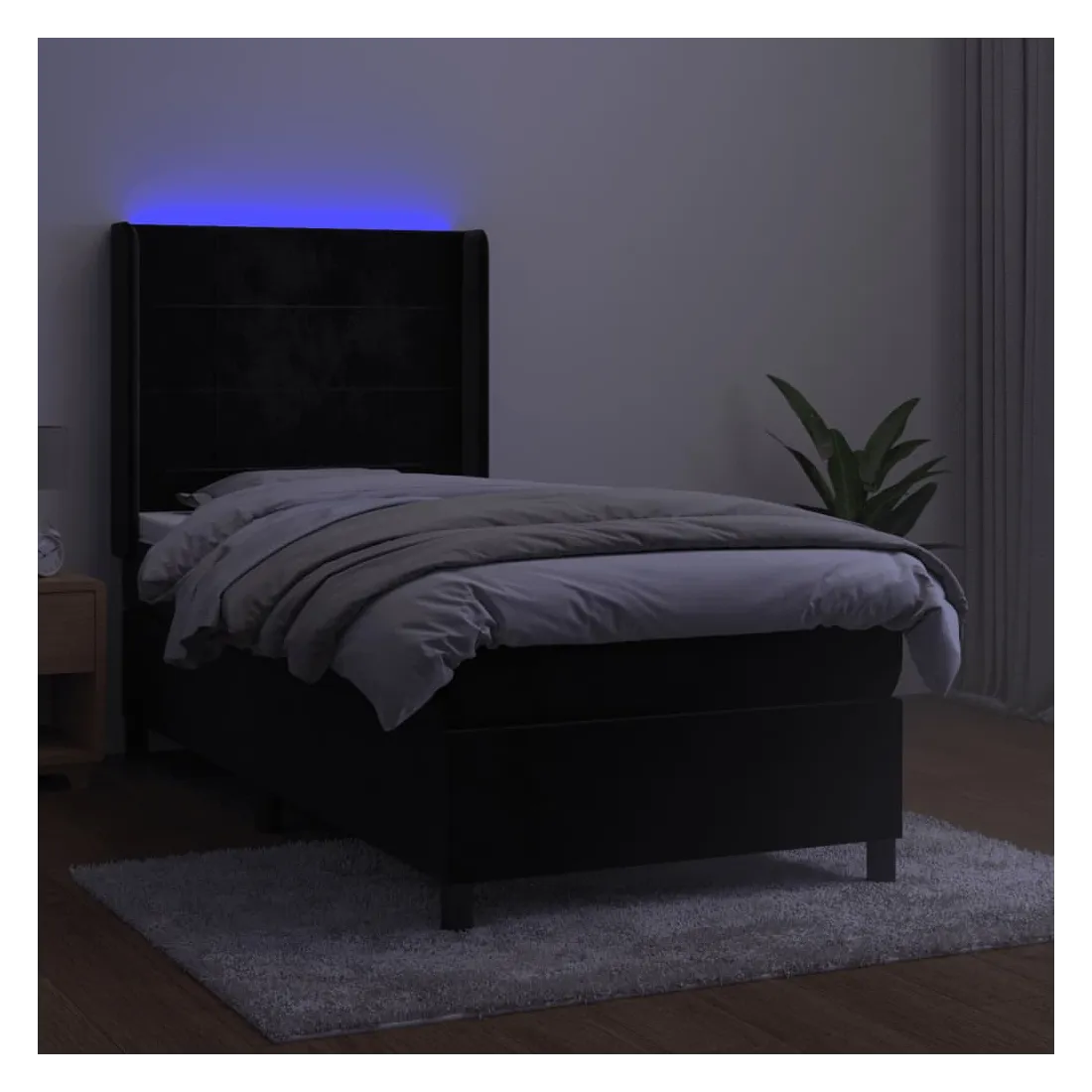 Utilisez ce sommier tapissier avec matelas et LED pour profiter d'un sommeil réparateur ! C'est le point central de votre chambre à coucher. Velours doux : le velours est un tissu doux et luxueux qui se reconnaît à son tas dense de fibres uniformément coupées qui ont une touche lisse. Le tissu en velours présente un toucher doux distinctif, ce qui le rend confortable au toucher.Tête de lit pratique : la tête de lit est réglable en hauteur selon vos préférences. La tête de lit vous offre un excellent soutien du dos lorsque vous êtes assis dans votre lit pour lire ou regarder la télévision.Bande LED colorée : apportez de l'éclairage dans l'obscurité avec des lumières LED colorées !Matelas à ressorts ensachés : le ressort ensaché individuel intégré est connu pour sa très haute qualité tout en assurant un haut niveau de durabilité et d'adaptabilité. Il peut absorber efficacement le bruit et les chocs causés par les sauts et les rotations.Protège-matelas doux pour la peau : le protège-matelas est recouvert d'un tissu résistant et doux pour la peau, ce qui le rend souple et confortable. Remarque :Pour des raisons d'hygiène, le matelas ne peut pas être retourné si l'emballage est retiré ou ouvert.Seule la partie avec un symbole de ciseaux peut être coupée et seule la partie avec l'USB continuera à fonctionner comme avant.Chaque produit est livré avec un manuel de montage dans la boîte pour un montage facile.Ce produit est doté d'un connecteur USB, mais la source d'alimentation certifiée de USB 5V n'est pas incluse.