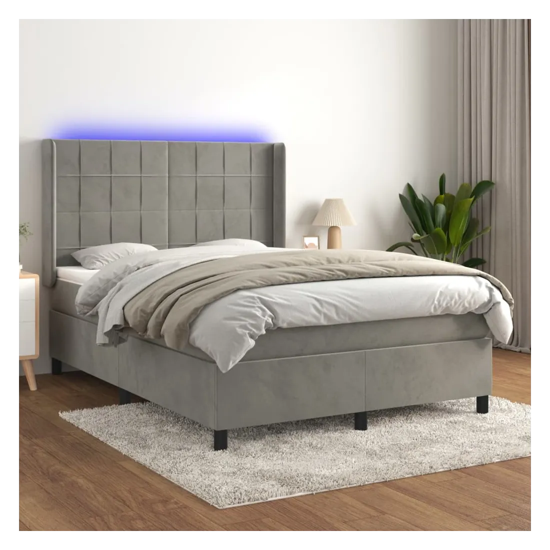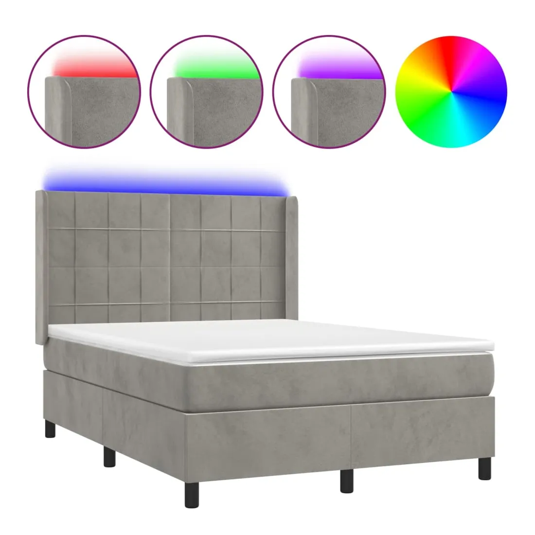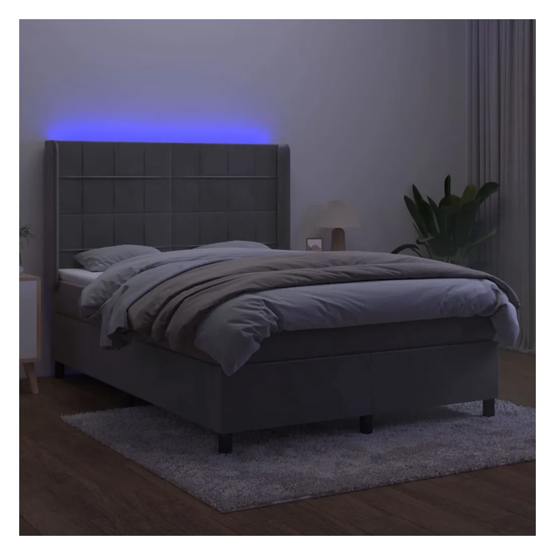 Utilisez ce sommier tapissier avec matelas et LED pour profiter d'un sommeil réparateur ! C'est le point central de votre chambre à coucher. Velours doux : le velours est un tissu doux et luxueux qui se reconnaît à son tas dense de fibres uniformément coupées qui ont une touche lisse. Le tissu en velours présente un toucher doux distinctif, ce qui le rend confortable au toucher.Tête de lit pratique : la tête de lit est réglable en hauteur selon vos préférences. La tête de lit vous offre un excellent soutien du dos lorsque vous êtes assis dans votre lit pour lire ou regarder la télévision.Bande LED colorée : apportez de l'éclairage dans l'obscurité avec des lumières LED colorées !Matelas à ressorts ensachés : le ressort ensaché individuel intégré est connu pour sa très haute qualité tout en assurant un haut niveau de durabilité et d'adaptabilité. Il peut absorber efficacement le bruit et les chocs causés par les sauts et les rotations.Protège-matelas doux pour la peau : le protège-matelas est recouvert d'un tissu résistant et doux pour la peau, ce qui le rend souple et confortable. Remarque :Pour des raisons d'hygiène, le matelas ne peut pas être retourné si l'emballage est retiré ou ouvert.Seule la partie avec un symbole de ciseaux peut être coupée et seule la partie avec l'USB continuera à fonctionner comme avant.Chaque produit est livré avec un manuel de montage dans la boîte pour un montage facile.Ce produit est doté d'un connecteur USB, mais la source d'alimentation certifiée de USB 5V n'est pas incluse.