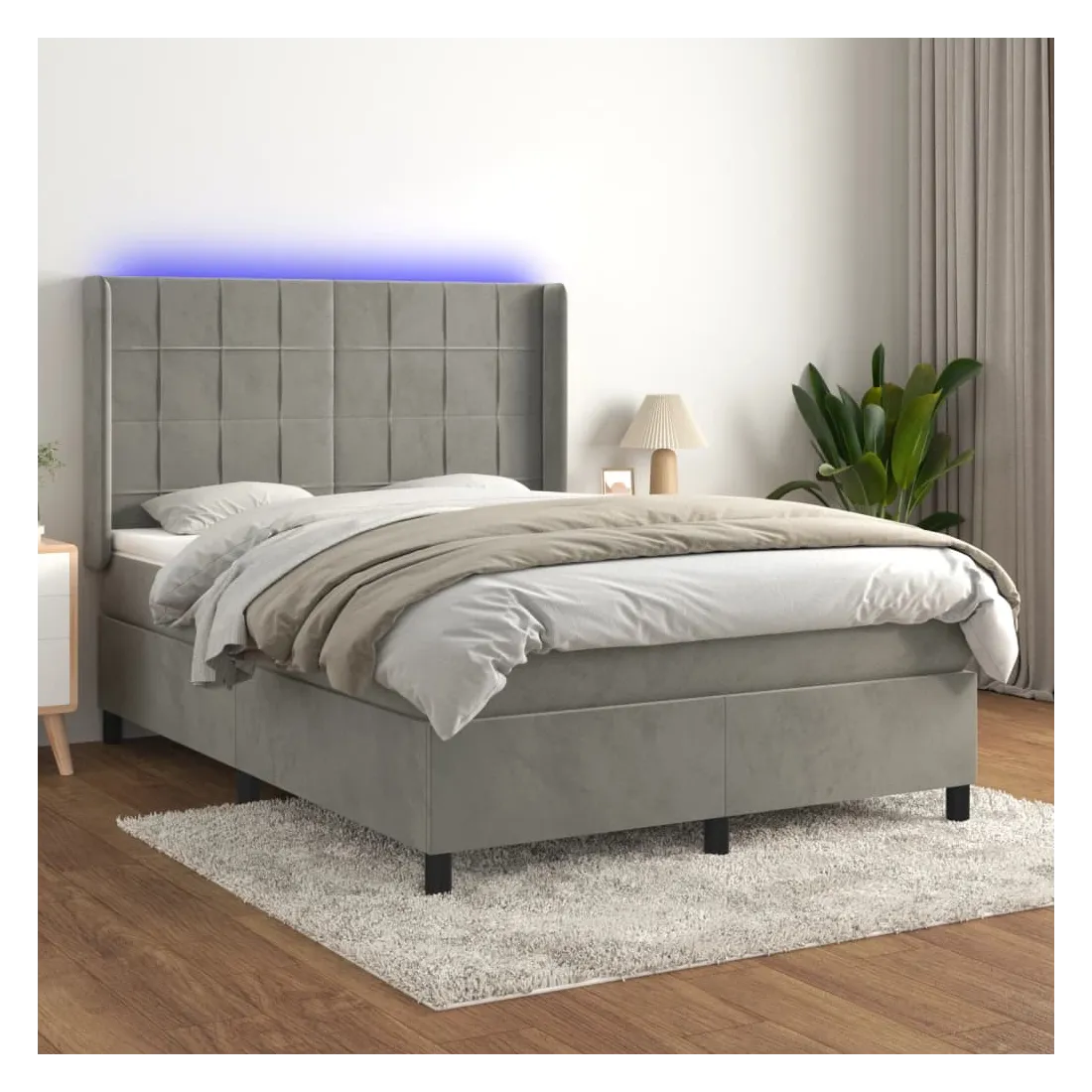 Utilisez ce sommier tapissier avec matelas et LED pour profiter d'un sommeil réparateur ! C'est le point central de votre chambre à coucher. Velours doux : le velours est un tissu doux et luxueux qui se reconnaît à son tas dense de fibres uniformément coupées qui ont une touche lisse. Le tissu en velours présente un toucher doux distinctif, ce qui le rend confortable au toucher.Tête de lit pratique : la tête de lit est réglable en hauteur selon vos préférences. La tête de lit vous offre un excellent soutien du dos lorsque vous êtes assis dans votre lit pour lire ou regarder la télévision.Bande LED colorée : apportez de l'éclairage dans l'obscurité avec des lumières LED colorées !Matelas à ressorts ensachés : le ressort ensaché individuel intégré est connu pour sa très haute qualité tout en assurant un haut niveau de durabilité et d'adaptabilité. Il peut absorber efficacement le bruit et les chocs causés par les sauts et les rotations.Protège-matelas doux pour la peau : le protège-matelas est recouvert d'un tissu résistant et doux pour la peau, ce qui le rend souple et confortable. Remarque :Pour des raisons d'hygiène, le matelas ne peut pas être retourné si l'emballage est retiré ou ouvert.Seule la partie avec un symbole de ciseaux peut être coupée et seule la partie avec l'USB continuera à fonctionner comme avant.Chaque produit est livré avec un manuel de montage dans la boîte pour un montage facile.Ce produit est doté d'un connecteur USB, mais la source d'alimentation certifiée de USB 5V n'est pas incluse.