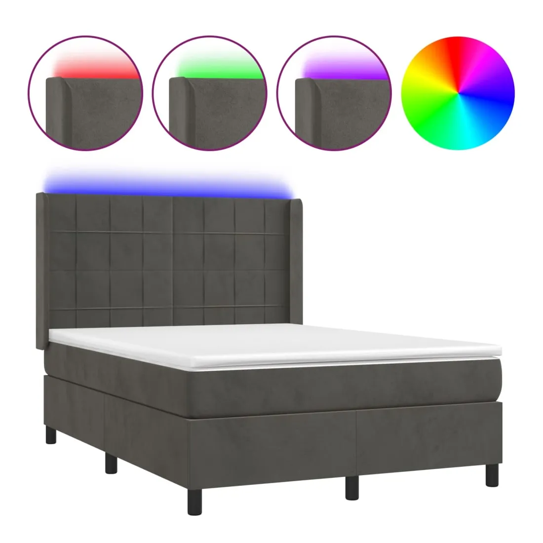 Utilisez ce sommier tapissier avec matelas et LED pour profiter d'un sommeil réparateur ! C'est le point central de votre chambre à coucher. Velours doux : le velours est un tissu doux et luxueux qui se reconnaît à son tas dense de fibres uniformément coupées qui ont une touche lisse. Le tissu en velours présente un toucher doux distinctif, ce qui le rend confortable au toucher.Tête de lit pratique : la tête de lit est réglable en hauteur selon vos préférences. La tête de lit vous offre un excellent soutien du dos lorsque vous êtes assis dans votre lit pour lire ou regarder la télévision.Bande LED colorée : apportez de l'éclairage dans l'obscurité avec des lumières LED colorées !Matelas à ressorts ensachés : le ressort ensaché individuel intégré est connu pour sa très haute qualité tout en assurant un haut niveau de durabilité et d'adaptabilité. Il peut absorber efficacement le bruit et les chocs causés par les sauts et les rotations.Protège-matelas doux pour la peau : le protège-matelas est recouvert d'un tissu résistant et doux pour la peau, ce qui le rend souple et confortable. Remarque :Pour des raisons d'hygiène, le matelas ne peut pas être retourné si l'emballage est retiré ou ouvert.Seule la partie avec un symbole de ciseaux peut être coupée et seule la partie avec l'USB continuera à fonctionner comme avant.Chaque produit est livré avec un manuel de montage dans la boîte pour un montage facile.Ce produit est doté d'un connecteur USB, mais la source d'alimentation certifiée de USB 5V n'est pas incluse.