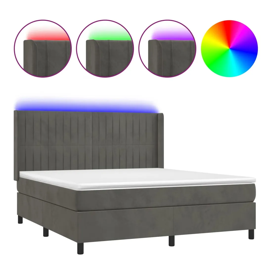 Utilisez ce sommier tapissier avec matelas et LED pour profiter d'un sommeil réparateur ! C'est le point central de votre chambre à coucher. Velours doux : le velours est un tissu doux et luxueux qui se reconnaît à son tas dense de fibres uniformément coupées qui ont une touche lisse. Le tissu en velours présente un toucher doux distinctif, ce qui le rend confortable au toucher.Tête de lit pratique : la tête de lit est réglable en hauteur selon vos préférences. La tête de lit vous offre un excellent soutien du dos lorsque vous êtes assis dans votre lit pour lire ou regarder la télévision.Bande LED colorée : apportez de l'éclairage dans l'obscurité avec des lumières LED colorées !Matelas à ressorts ensachés : le ressort ensaché individuel intégré est connu pour sa très haute qualité tout en assurant un haut niveau de durabilité et d'adaptabilité. Il peut absorber efficacement le bruit et les chocs causés par les sauts et les rotations.Protège-matelas doux pour la peau : le protège-matelas est recouvert d'un tissu résistant et doux pour la peau, ce qui le rend souple et confortable. Remarque :Pour des raisons d'hygiène, le matelas ne peut pas être retourné si l'emballage est retiré ou ouvert.Seule la partie avec un symbole de ciseaux peut être coupée et seule la partie avec l'USB continuera à fonctionner comme avant.Chaque produit est livré avec un manuel de montage dans la boîte pour un montage facile.Ce produit est doté d'un connecteur USB, mais la source d'alimentation certifiée de USB 5V n'est pas incluse.