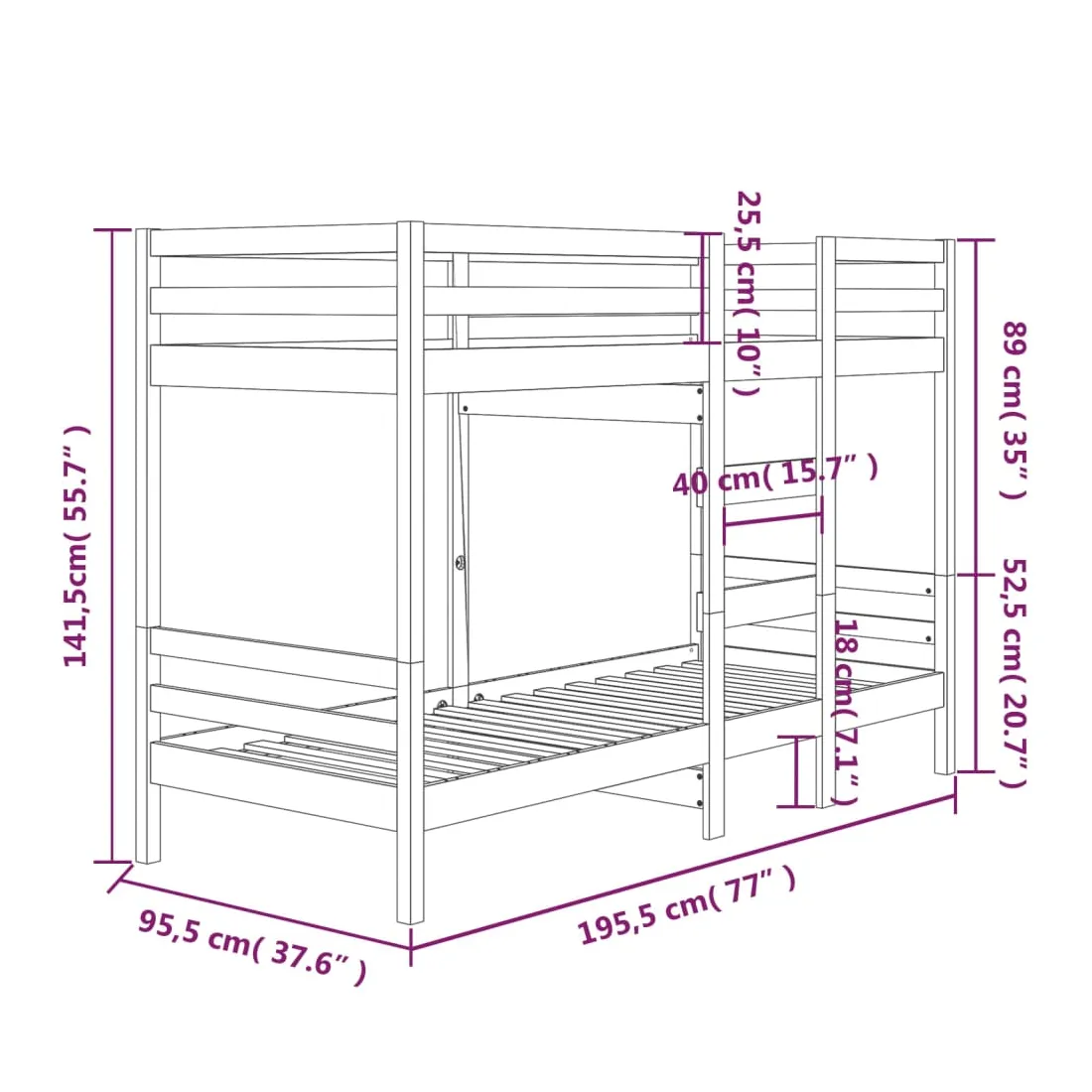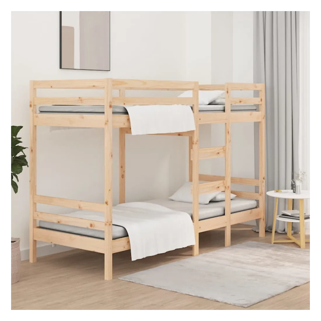 Ce lit superposé en bois est élégant et fonctionnel, ce qui en fait un supplément parfait à toute pièce dont l'espace est limité. Bois de pin massif : le bois de pin massif est un matériau naturel magnifique. Le bois de pin a un grain droit et les nœuds donnent au matériau son aspect caractéristique et rustique. Design sûr : le lit surélevé est conçu dans un souci de sécurité. Il comprend des garde-corps qui empêchent l'utilisateur de rouler pendant son sommeil. Convient aux espaces limités : le lit superposé en bois massif est un excellent choix pour toute pièce dont l'espace est limité. Il fournit deux lits individuels avec un design compact. Remarque : La livraison comprend uniquement les cadres de lit. Les matelas ne sont pas inclus. Vous pouvez consulter notre boutique pour trouve