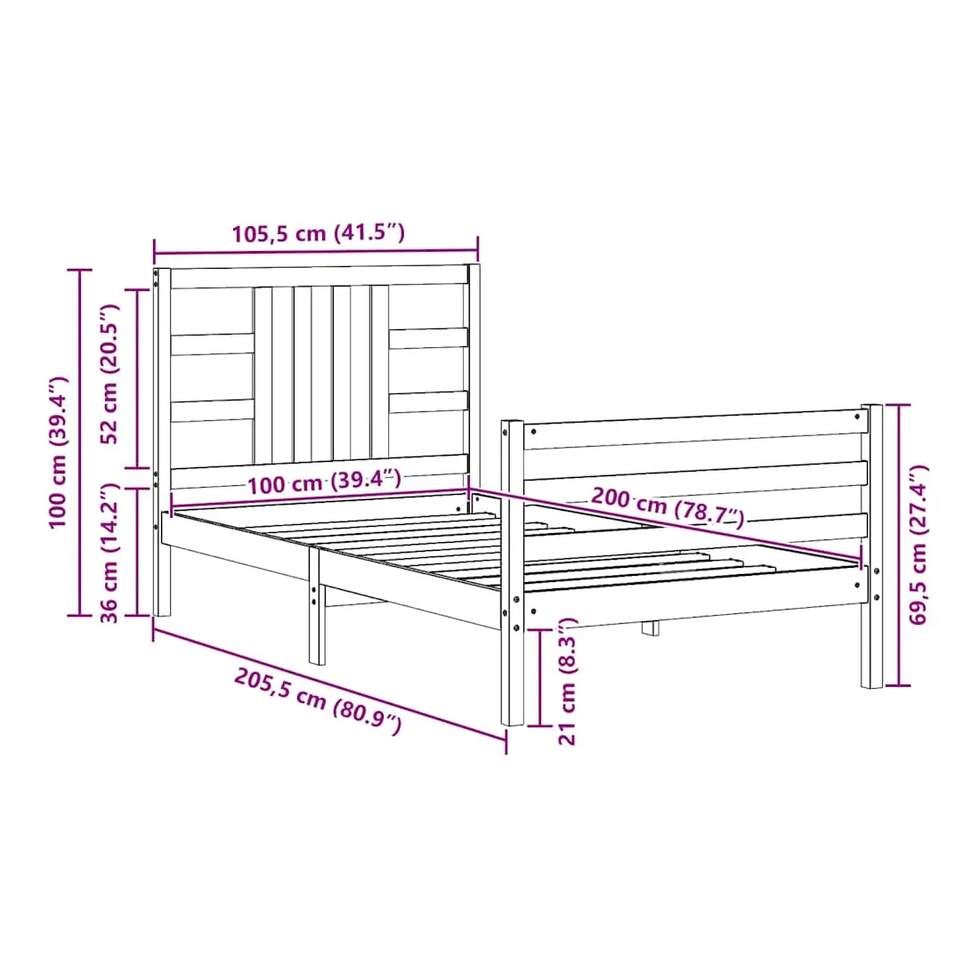 - Dimensions totales du lit : 205,5 x 105,5 x 100 cm (L x l x H)