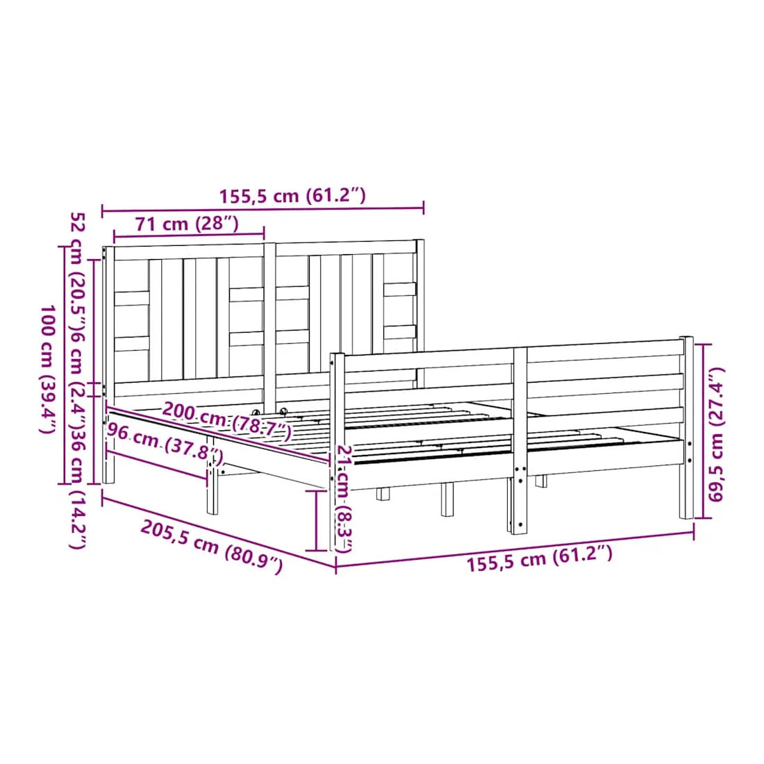 - Dimensions totales du lit : 205,5 x 155,5 x 100 cm (L x l x H)