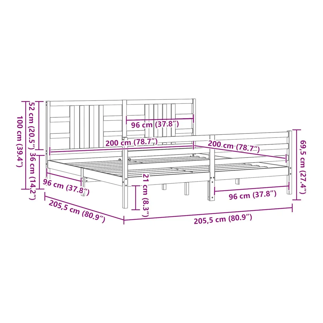 - Dimensions totales du lit : 205,5 x 205,5 x 100 cm (L x l x H)