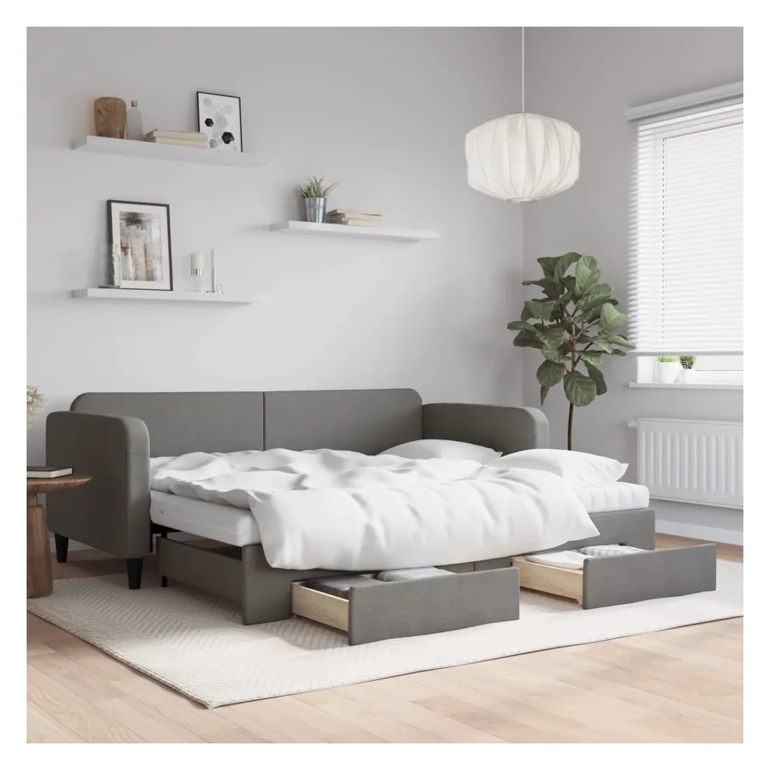 Ce lit de repos 2 en 1 avec lit gigogne, servant à la fois de canapé et de lit, constitue un supplément pratique et accrocheur à votre salon ou chambre à coucher. Lit de repos polyvalent : le canapé-lit fonctionne comme un canapé pendant la journée et se transforme facilement en lit double la nuit en retirant le lit gigogne, offrant une solution pratique pour accueillir des invités et maximiser l'espace.Grand espace de rangement : ce lit d'appoint dispose de deux tiroirs à roulettes qui offrent suffisamment d'espace pour ranger vos vêtements, chaussettes, jouets, coussins, etc.Matelas en mousse confortable : ce lit est fourni avec deux matelas en mousse pour un soutien maximal et un confort optimal.Tissu durable et construction solide : ce canapé-lit a une structure robuste en bois et en métal et est recouvert d'un tissu durable et confortable.