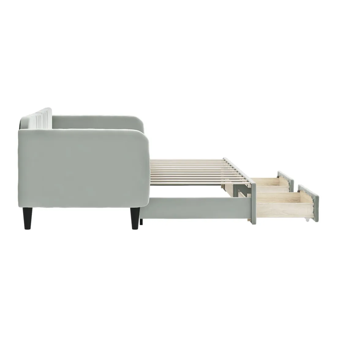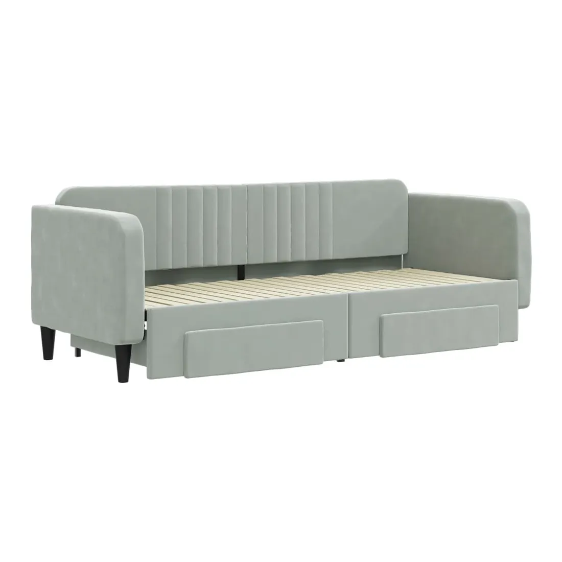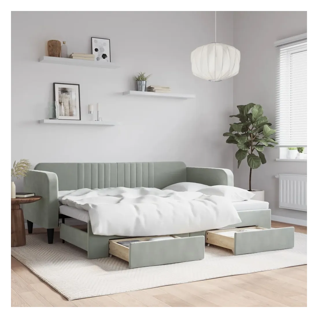 Ce lit de repos 2 en 1 avec lit gigogne, servant à la fois de canapé et de lit, constitue un supplément pratique et accrocheur à votre salon ou chambre à coucher. Lit de repos polyvalent : le canapé-lit fonctionne comme un canapé pendant la journée et se transforme facilement en lit double la nuit en retirant le lit gigogne, offrant une solution pratique pour accueillir des invités et maximiser l'espace.Grand espace de rangement : ce lit d'appoint dispose de deux tiroirs à roulettes qui offrent suffisamment d'espace pour ranger vos vêtements, chaussettes, jouets, coussins, etc.Velours doux et construction solide : ce canapé-lit a un cadre robuste en bois et en métal et est recouvert de velours doux et confortable.Design moderne : le canapé-lit a un design moderne qui présente des lignes épurées, un aspect minimaliste, ainsi que de la lumière naturelle, et ajoutera un style moderne à votre intérieur ! Bon à savoir :Les matelas ne sont pas inclus avec ce lit. Nous proposons une sélection variée de matelas. Vous pouvez consulter notre boutique pour trouver les matelas assortis.