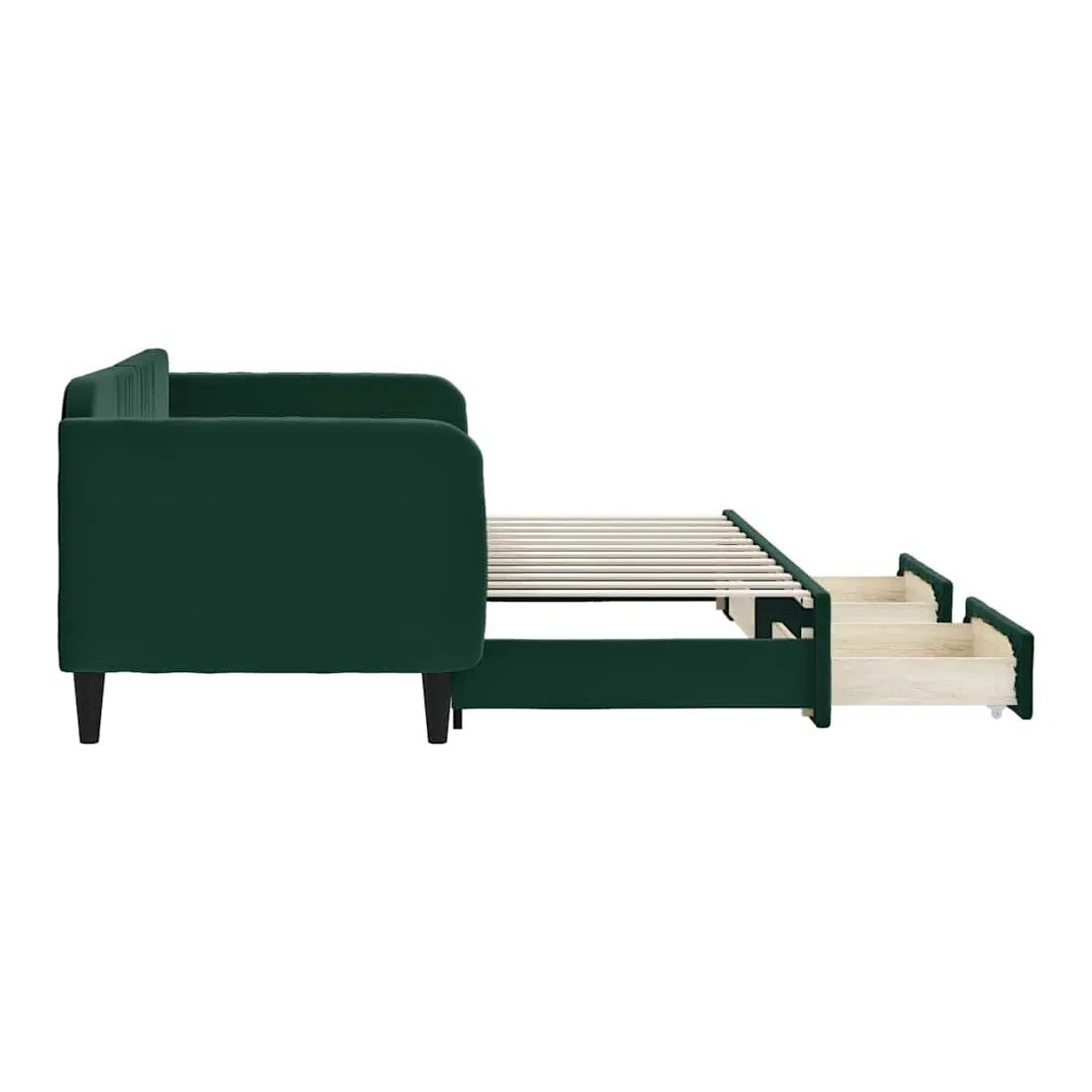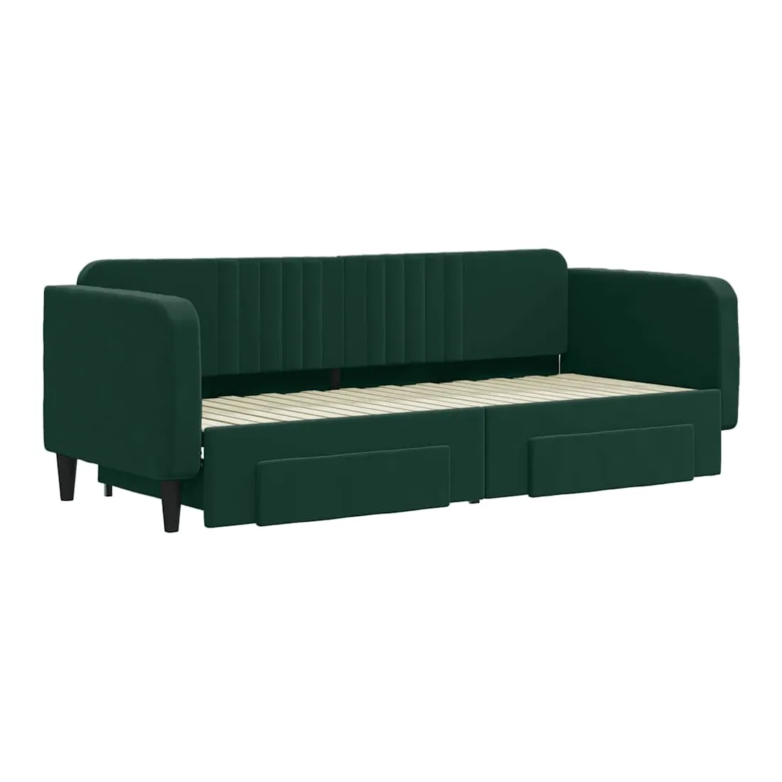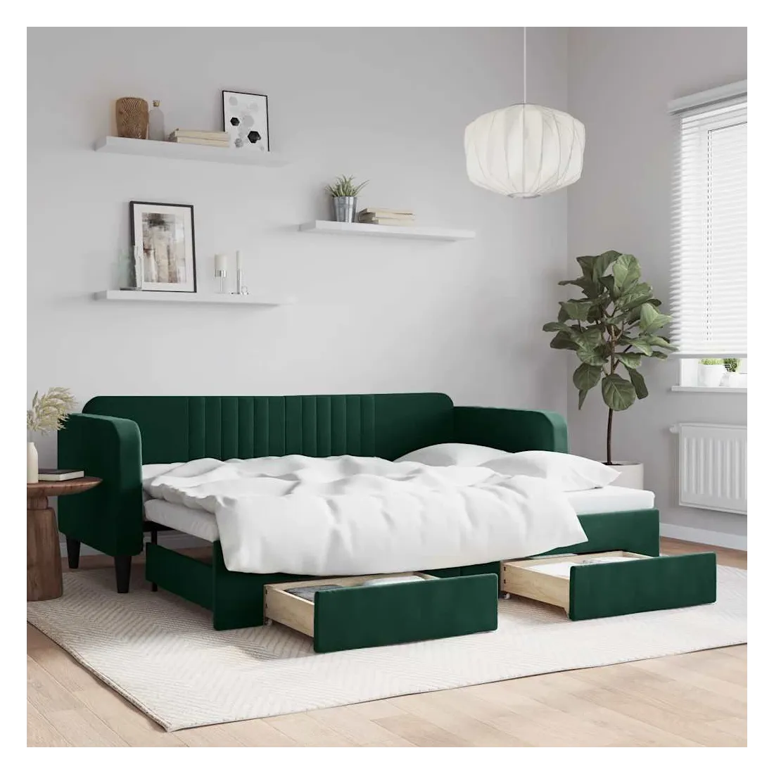 Ce lit de repos 2 en 1 avec lit gigogne, servant à la fois de canapé et de lit, constitue un supplément pratique et accrocheur à votre salon ou chambre à coucher. Lit de repos polyvalent : le canapé-lit fonctionne comme un canapé pendant la journée et se transforme facilement en lit double la nuit en retirant le lit gigogne, offrant une solution pratique pour accueillir des invités et maximiser l'espace.Grand espace de rangement : ce lit d'appoint dispose de deux tiroirs à roulettes qui offrent suffisamment d'espace pour ranger vos vêtements, chaussettes, jouets, coussins, etc.Velours doux et construction solide : ce canapé-lit a un cadre robuste en bois et en métal et est recouvert de velours doux et confortable.Design moderne : le canapé-lit a un design moderne qui présente des lignes épurées, un aspect minimaliste, ainsi que de la lumière naturelle, et ajoutera un style moderne à votre intérieur ! Bon à savoir :Les matelas ne sont pas inclus avec ce lit. Nous proposons une sélection variée de matelas. Vous pouvez consulter notre boutique pour trouver les matelas assortis.