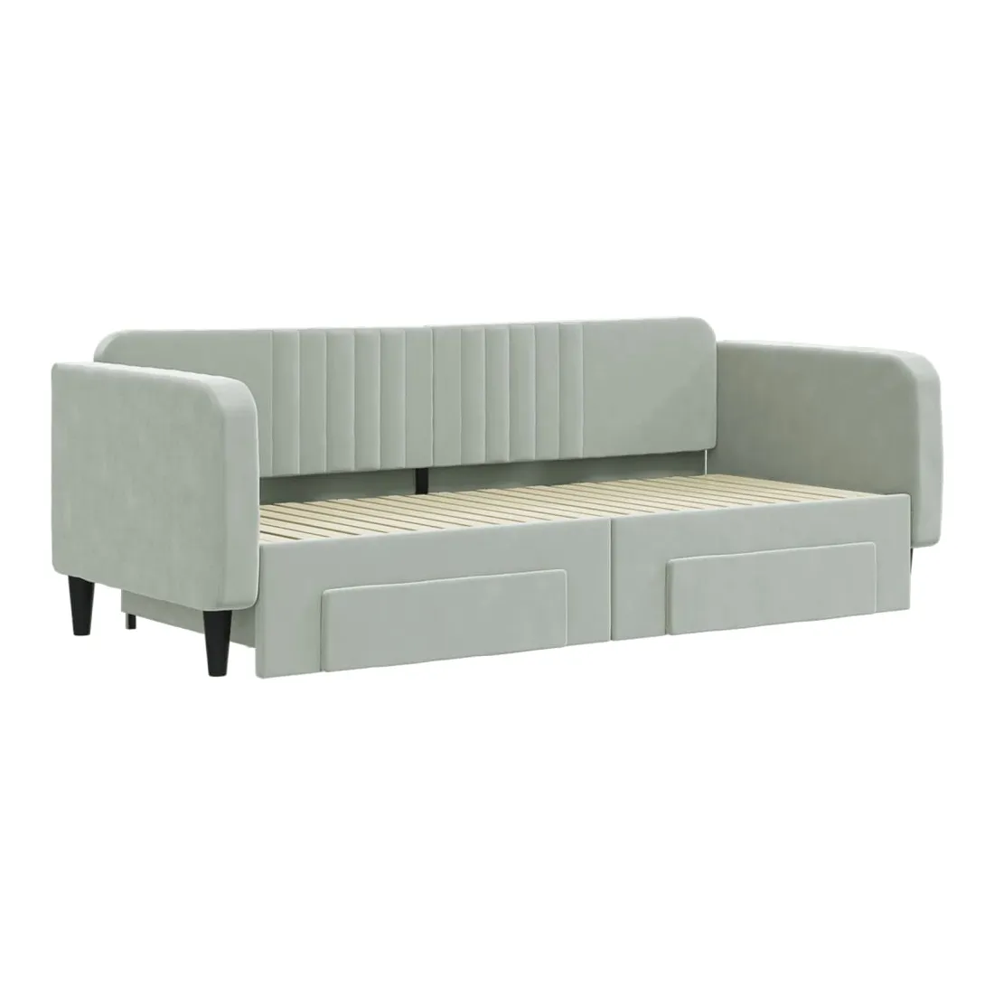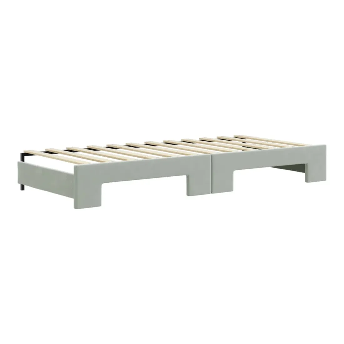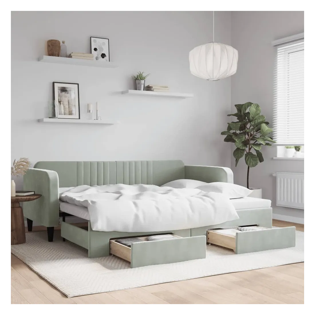 Ce lit de repos 2 en 1 avec lit gigogne, servant à la fois de canapé et de lit, constitue un supplément pratique et accrocheur à votre salon ou chambre à coucher. Lit de repos polyvalent : le canapé-lit fonctionne comme un canapé pendant la journée et se transforme facilement en lit double la nuit en retirant le lit gigogne, offrant une solution pratique pour accueillir des invités et maximiser l'espace.Grand espace de rangement : ce lit d'appoint dispose de deux tiroirs à roulettes qui offrent suffisamment d'espace pour ranger vos vêtements, chaussettes, jouets, coussins, etc.Velours doux et construction solide : ce canapé-lit a un cadre robuste en bois et en métal et est recouvert de velours doux et confortable.Design moderne : le canapé-lit a un design moderne qui présente des lignes épurées, un aspect minimaliste, ainsi que de la lumière naturelle, et ajoutera un style moderne à votre intérieur ! Bon à savoir :Les matelas ne sont pas inclus avec ce lit. Nous proposons une sélection variée de matelas. Vous pouvez consulter notre boutique pour trouver les matelas assortis.