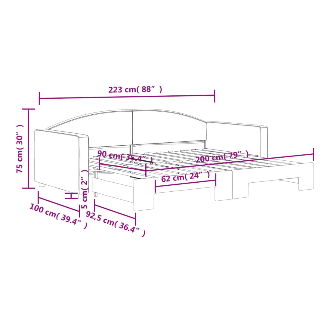 - Dimensions (non déployé) : 223 x 100 x 75 cm (l x P x H)