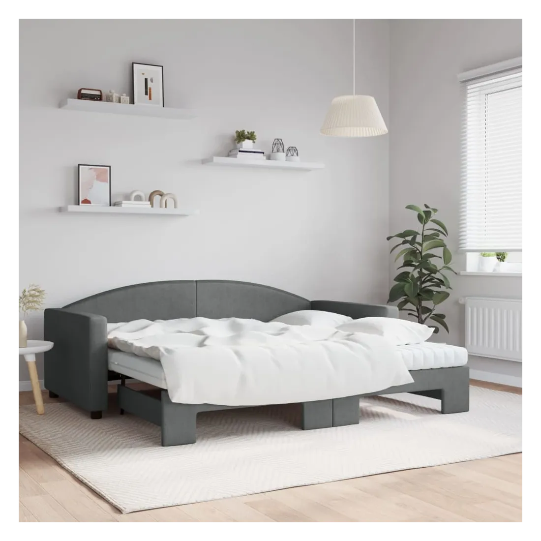 Ce lit de repos 2 en 1 avec lit gigogne, servant à la fois de canapé et de lit, constitue un supplément pratique et accrocheur à votre salon ou chambre à coucher. Lit de repos polyvalent : le canapé-lit fonctionne comme un canapé pendant la journée et se transforme facilement en lit double la nuit en retirant le lit gigogne, offrant une solution pratique pour accueillir des invités et maximiser l'espace.Matelas en mousse confortable : ce lit est fourni avec deux matelas en mousse pour un soutien maximal et un confort optimal.Tissu durable et construction solide : ce canapé-lit a une structure robuste en bois et en métal et est recouvert d'un tissu durable et confortable.Design moderne : le canapé-lit a un design moderne qui présente des lignes épurées, un aspect minimaliste, ainsi que de la lumière naturelle, et ajoutera un style moderne à votre intérieur !