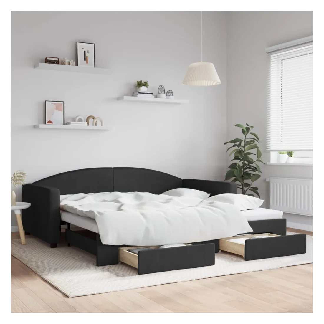 Ce lit de repos 2 en 1 avec lit gigogne, servant à la fois de canapé et de lit, constitue un supplément pratique et accrocheur à votre salon ou chambre à coucher. Lit de repos polyvalent : le canapé-lit fonctionne comme un canapé pendant la journée et se transforme facilement en lit double la nuit en retirant le lit gigogne, offrant une solution pratique pour accueillir des invités et maximiser l'espace.Grand espace de rangement : ce lit d'appoint dispose de deux tiroirs à roulettes qui offrent suffisamment d'espace pour ranger vos vêtements, chaussettes, jouets, coussins, etc.Tissu durable et construction solide : ce canapé-lit a une structure robuste en bois et en métal et est recouvert d'un tissu durable et confortable. Bon à savoir :Les matelas ne sont pas inclus avec ce lit. Nous proposons une sélection variée de matelas. Vous pouvez consulter notre boutique pour trouver les matelas assortis.
