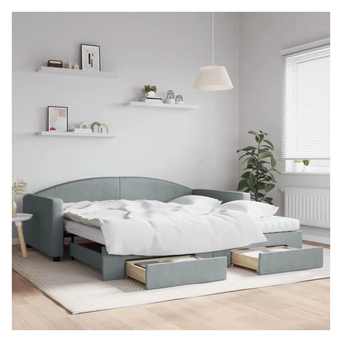Ce lit de repos 2 en 1 avec lit gigogne, servant à la fois de canapé et de lit, constitue un supplément pratique et accrocheur à votre salon ou chambre à coucher. Lit de repos polyvalent : le canapé-lit fonctionne comme un canapé pendant la journée et se transforme facilement en lit double la nuit en retirant le lit gigogne, offrant une solution pratique pour accueillir des invités et maximiser l'espace.Grand espace de rangement : ce lit d'appoint dispose de deux tiroirs à roulettes qui offrent suffisamment d'espace pour ranger vos vêtements, chaussettes, jouets, coussins, etc.Matelas en mousse confortable : ce lit est fourni avec deux matelas en mousse pour un soutien maximal et un confort optimal.Tissu durable et construction solide : ce canapé-lit a une structure robuste en bois et en métal et est recouvert d'un tissu durable et confortable.