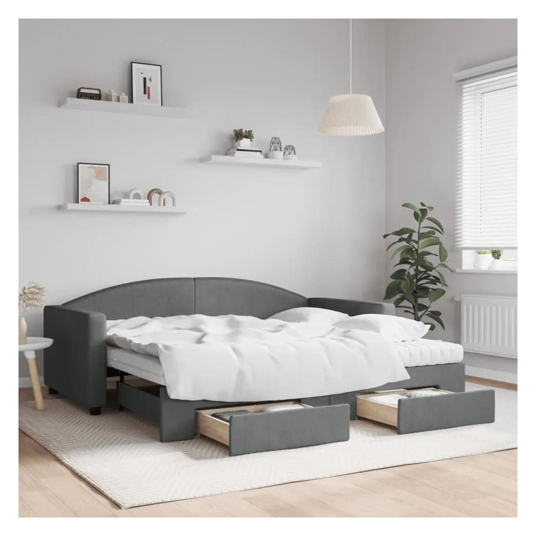 Ce lit de repos 2 en 1 avec lit gigogne, servant à la fois de canapé et de lit, constitue un supplément pratique et accrocheur à votre salon ou chambre à coucher. Lit de repos polyvalent : le canapé-lit fonctionne comme un canapé pendant la journée et se transforme facilement en lit double la nuit en retirant le lit gigogne, offrant une solution pratique pour accueillir des invités et maximiser l'espace.Grand espace de rangement : ce lit d'appoint dispose de deux tiroirs à roulettes qui offrent suffisamment d'espace pour ranger vos vêtements, chaussettes, jouets, coussins, etc.Matelas en mousse confortable : ce lit est fourni avec deux matelas en mousse pour un soutien maximal et un confort optimal.Tissu durable et construction solide : ce canapé-lit a une structure robuste en bois et en métal et est recouvert d'un tissu durable et confortable.