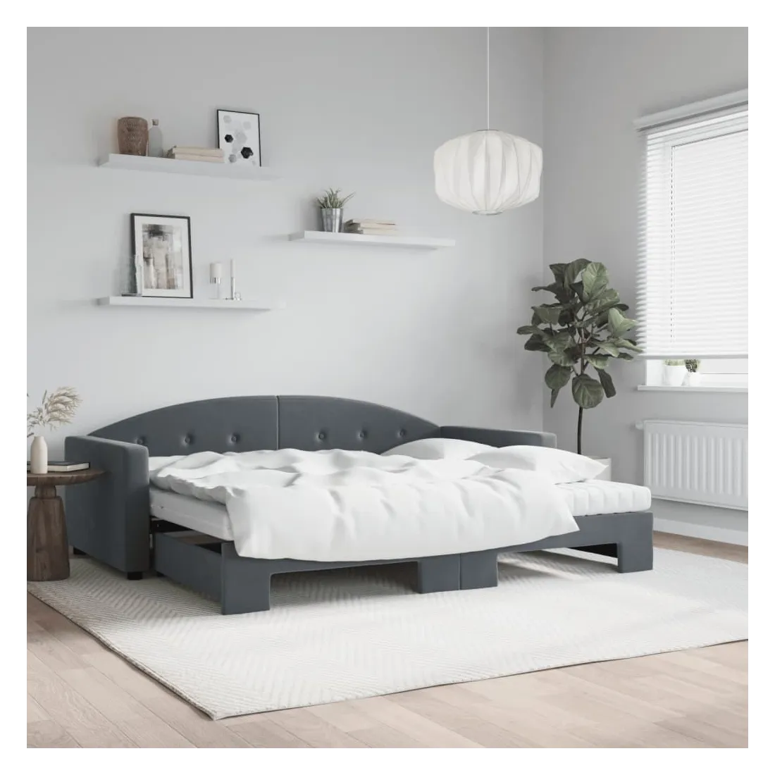 Ce lit de repos 2 en 1 avec lit gigogne et matelas, servant à la fois de canapé et de lit, constitue un supplément pratique et accrocheur à votre salon ou chambre à coucher. Lit de repos polyvalent : le canapé-lit fonctionne comme un canapé pendant la journée et se transforme facilement en lit double la nuit en retirant le lit gigogne, offrant une solution pratique pour accueillir des invités et maximiser l'espace.Matelas en mousse confortable : ce lit est fourni avec deux matelas en mousse pour un soutien maximal et un confort optimal. Velours doux et construction solide : ce canapé-lit a un cadre robuste en bois et en métal et est recouvert de velours doux et confortable.