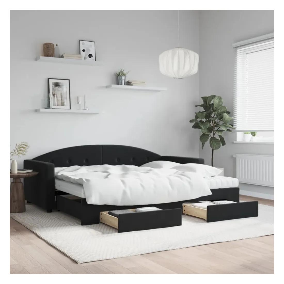 Ce lit de repos 2 en 1 avec lit gigogne et tiroirs, servant à la fois de canapé et de lit, constitue un ajout pratique et accrocheur à votre salon ou chambre à coucher. Lit de repos polyvalent : le canapé-lit fonctionne comme un canapé pendant la journée et se transforme facilement en lit double la nuit en retirant le lit gigogne, offrant une solution pratique pour accueillir des invités et maximiser l'espace. Grand espace de rangement : ce lit d'appoint dispose de deux tiroirs à roulettes qui offrent suffisamment d'espace pour ranger vos vêtements, chaussettes, jouets, coussins, etc. Matelas en mousse confortable : ce lit est fourni avec deux matelas en mousse pour un soutien maximal et un confort optimal. Velours doux et construction solide : ce canapé-lit a un cadre robuste en bois et en métal et est recouvert de velours doux et confortable.