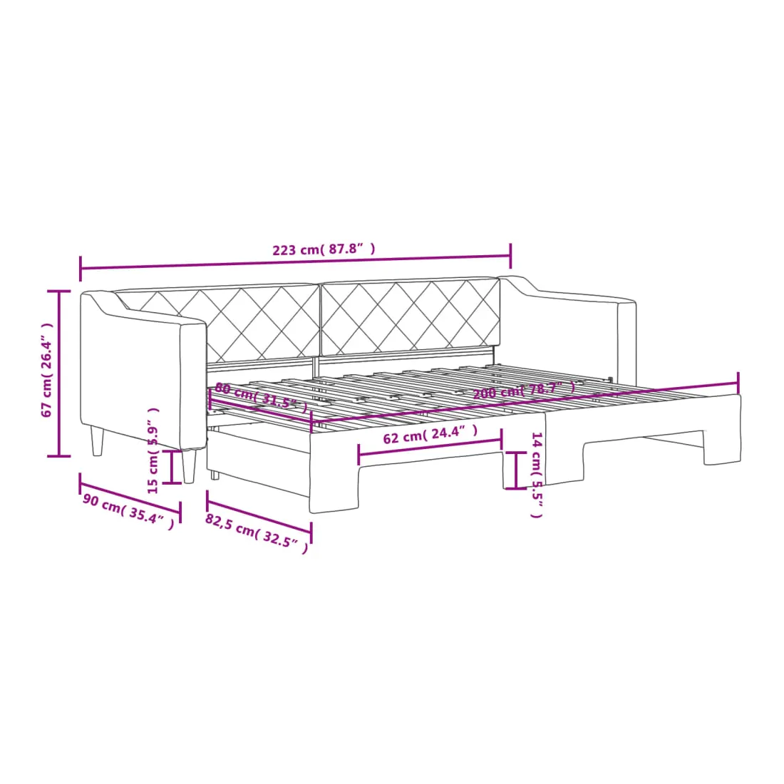 - Dimensions (non étendu) : 223 x 90 x 67 cm (L x l x H)