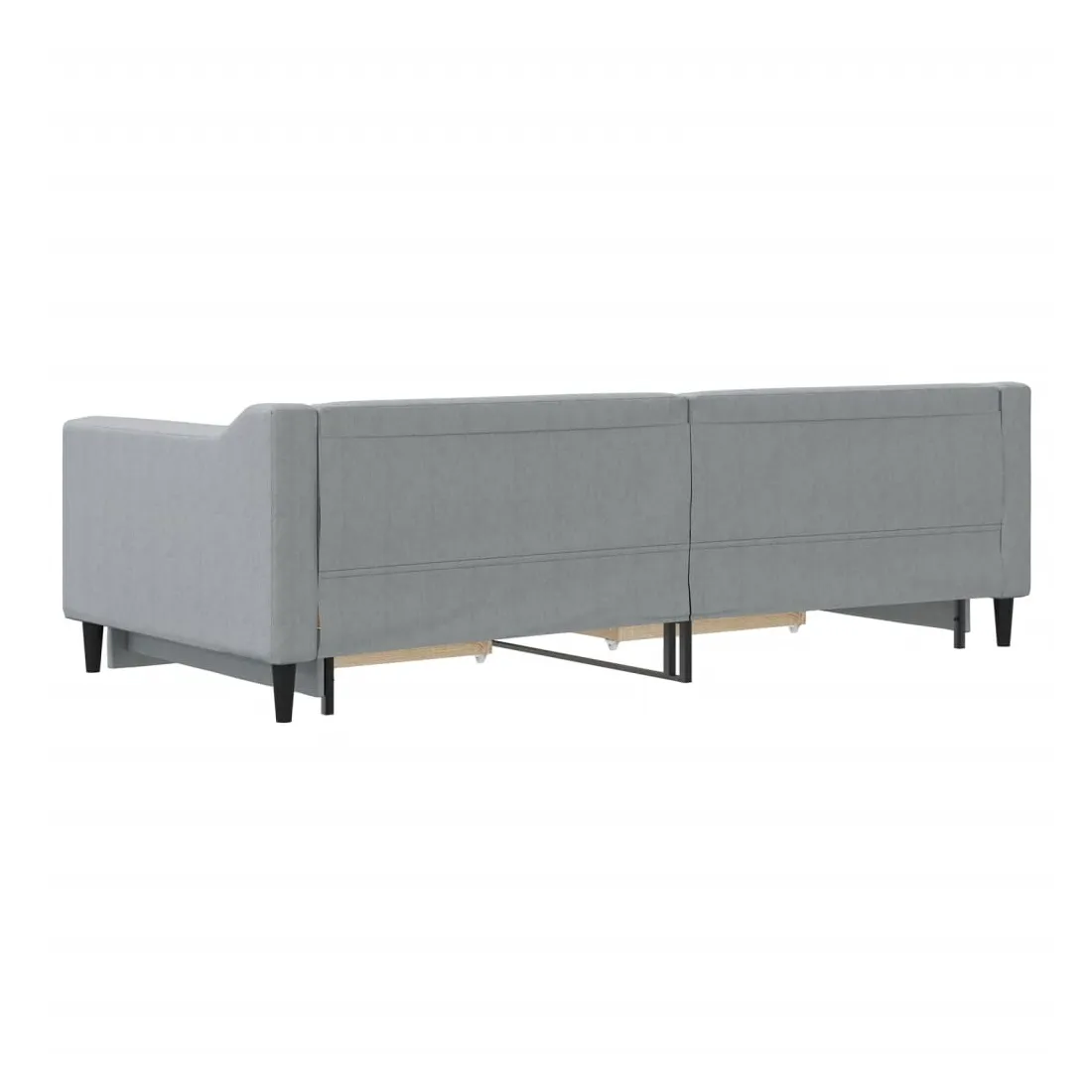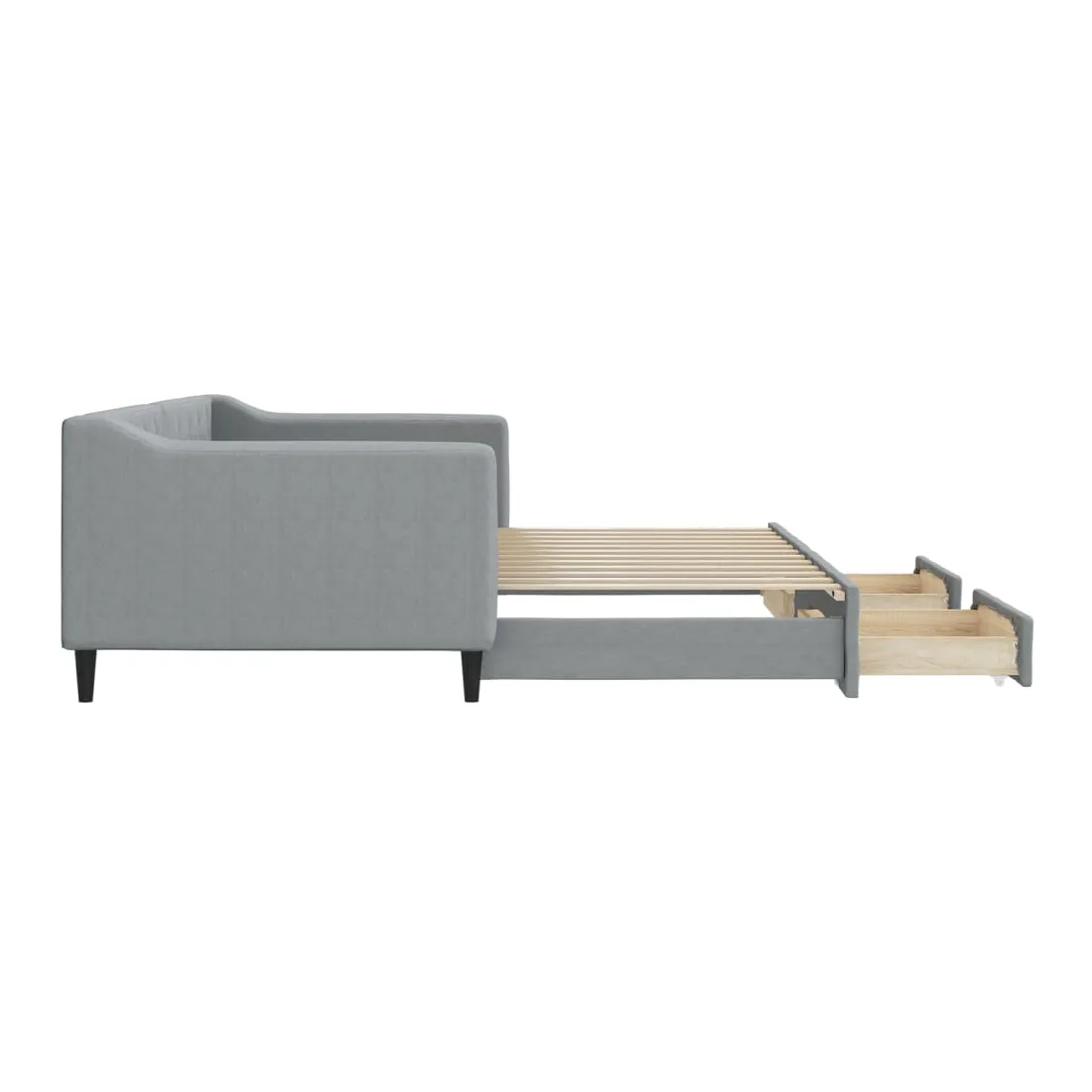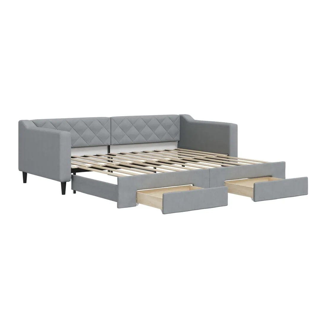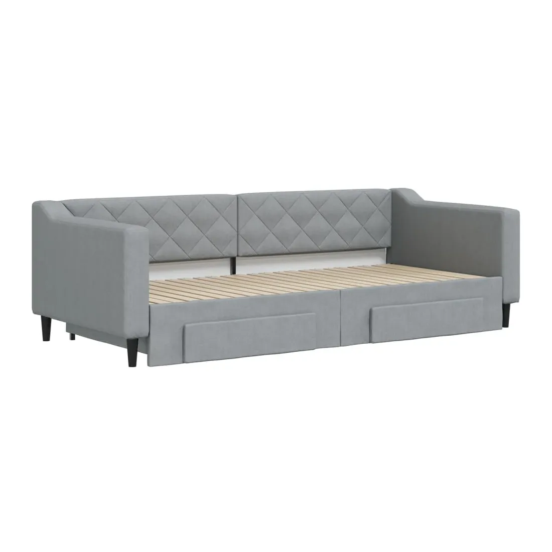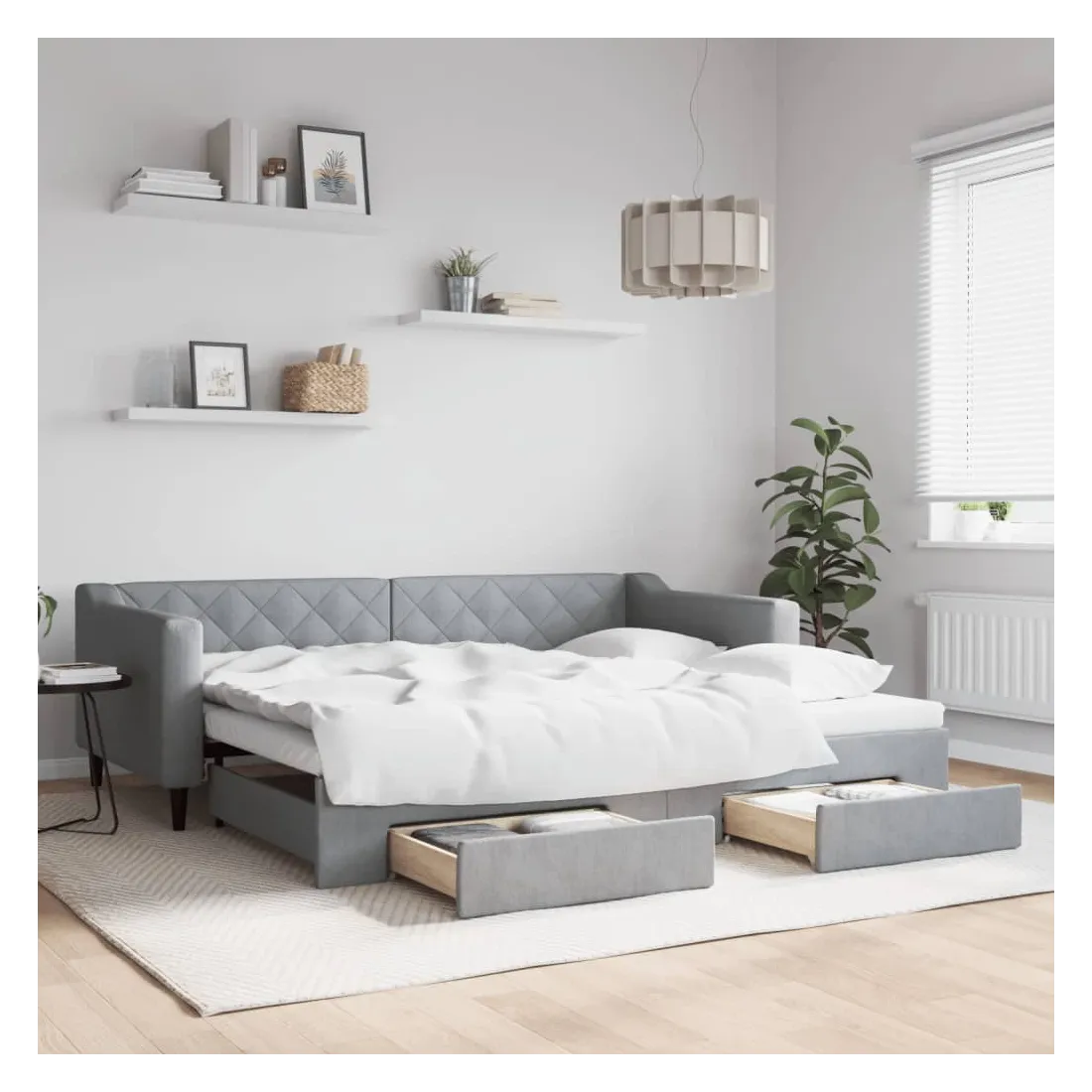 Ce lit de repos 2 en 1 avec lit gigogne, servant à la fois de canapé et de lit, constitue un supplément pratique et accrocheur à votre salon ou chambre à coucher. Lit de repos polyvalent : le canapé-lit fonctionne comme un canapé pendant la journée et se transforme facilement en lit double la nuit en retirant le lit gigogne, offrant une solution pratique pour accueillir des invités et maximiser l'espace. Grand espace de rangement : ce lit d'appoint dispose de deux tiroirs à roulettes qui offrent suffisamment d'espace pour ranger vos vêtements, chaussettes, jouets, coussins, etc. Tissu durable et construction solide : ce canapé-lit a une structure robuste en bois et en métal et est recouvert d'un tissu durable et confortable.Design moderne : le canapé-lit a un design moderne qui présente des lignes épurées, un aspect minimaliste, et ajoutera un style moderne à votre intérieur ! Bon à savoir :Les matelas ne sont pas inclus avec ce lit. Nous proposons une sélection variée de matelas. Vous pouvez consulter notre boutique pour trouver les matelas assortis.