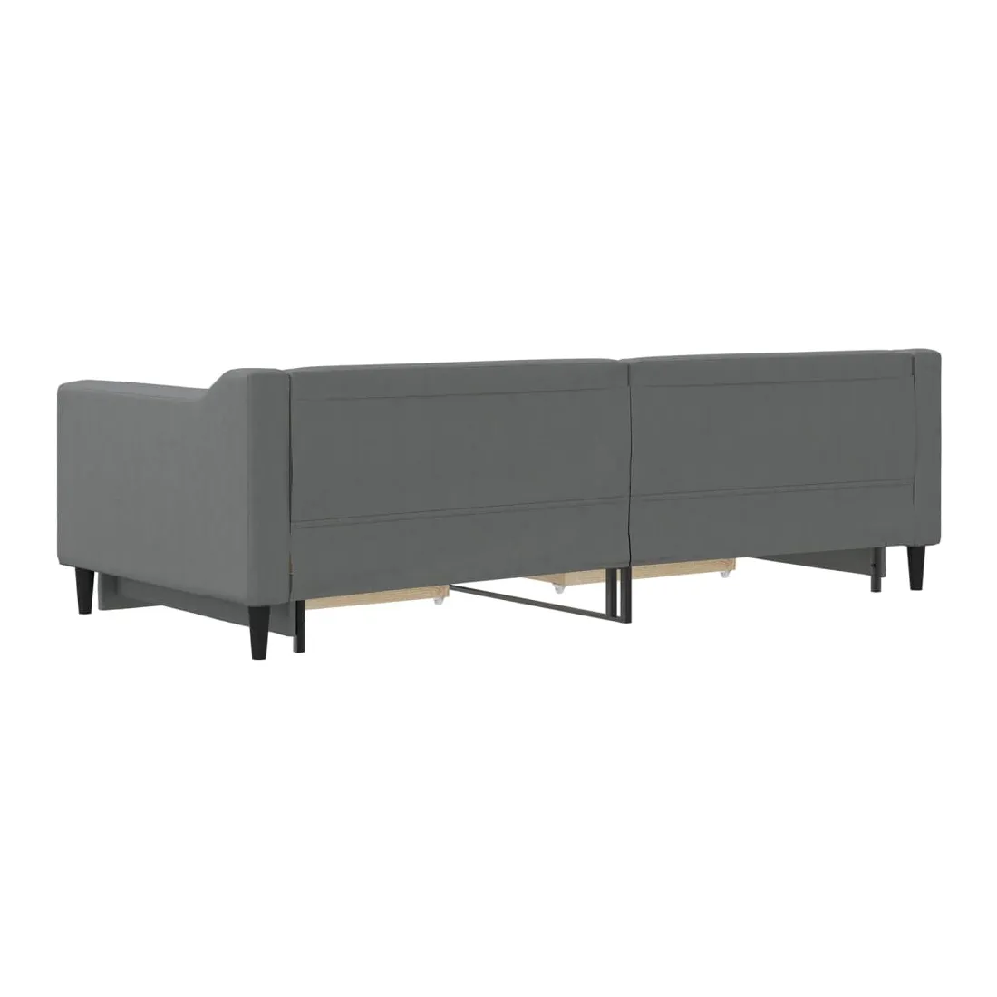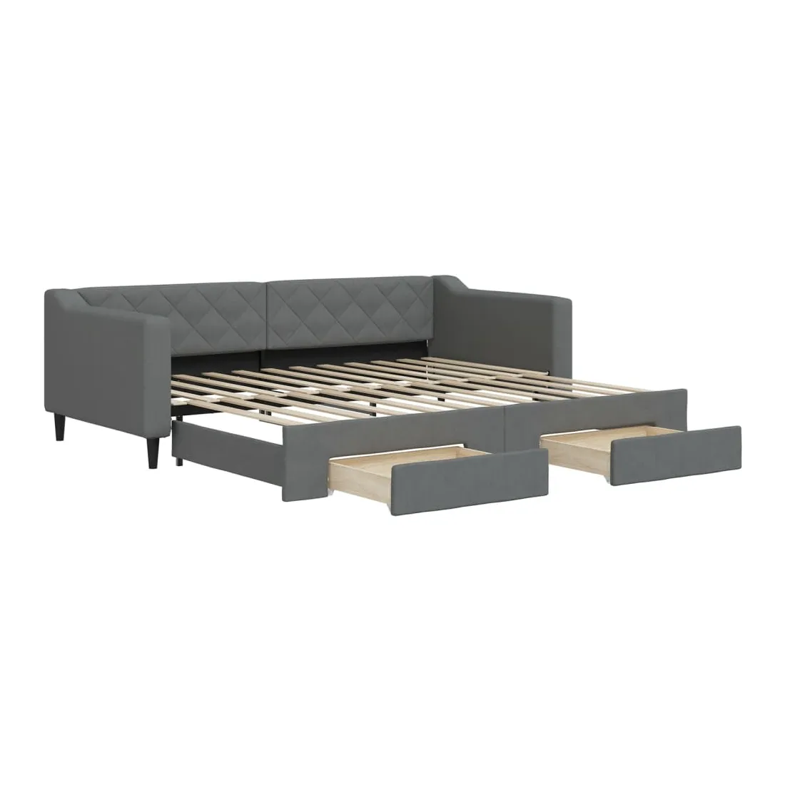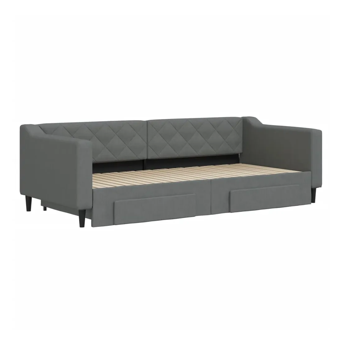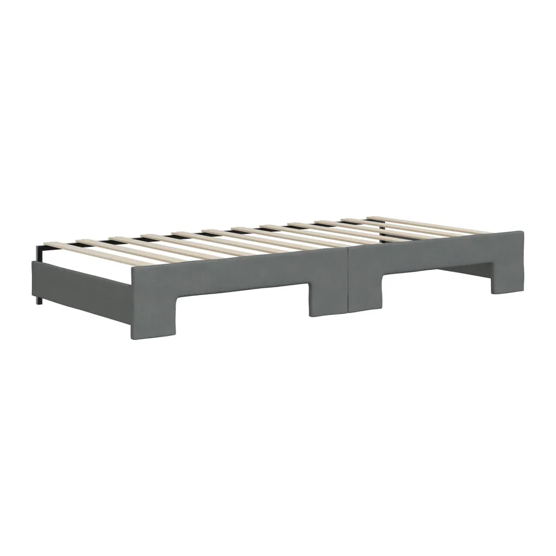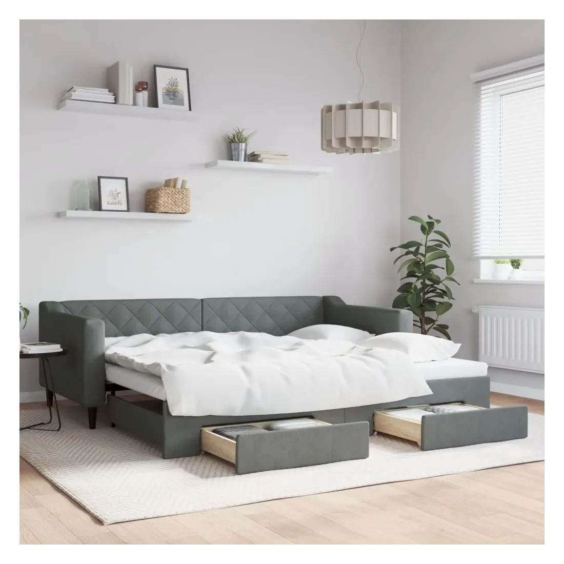 Ce lit de repos 2 en 1 avec lit gigogne, servant à la fois de canapé et de lit, constitue un supplément pratique et accrocheur à votre salon ou chambre à coucher. Lit de repos polyvalent : le canapé-lit fonctionne comme un canapé pendant la journée et se transforme facilement en lit double la nuit en retirant le lit gigogne, offrant une solution pratique pour accueillir des invités et maximiser l'espace. Grand espace de rangement : ce lit d'appoint dispose de deux tiroirs à roulettes qui offrent suffisamment d'espace pour ranger vos vêtements, chaussettes, jouets, coussins, etc. Tissu durable et construction solide : ce canapé-lit a une structure robuste en bois et en métal et est recouvert d'un tissu durable et confortable.Design moderne : le canapé-lit a un design moderne qui présente des lignes épurées, un aspect minimaliste, et ajoutera un style moderne à votre intérieur ! Bon à savoir :Les matelas ne sont pas inclus avec ce lit. Nous proposons une sélection variée de matelas. Vous pouvez consulter notre boutique pour trouver les matelas assortis.