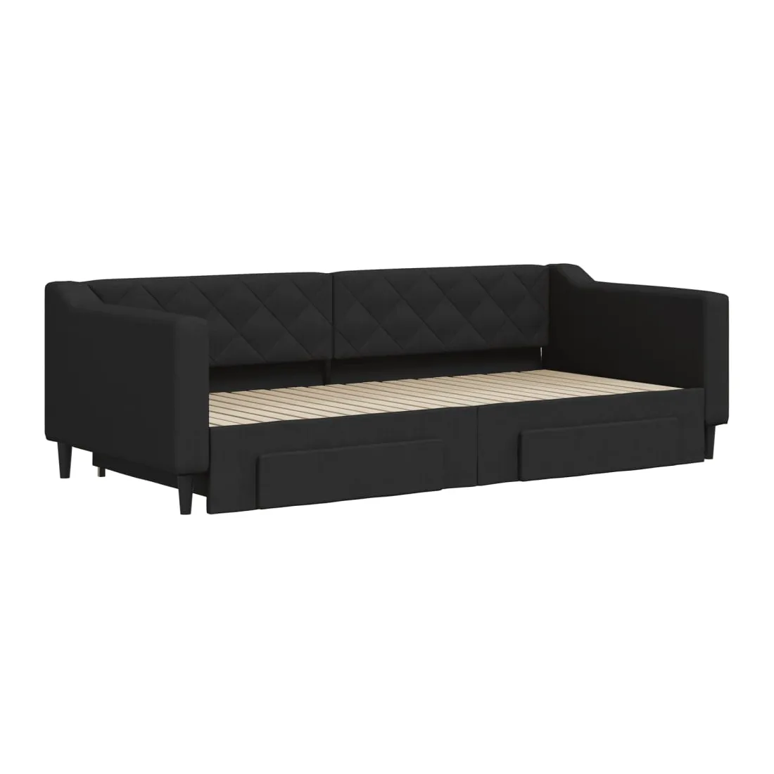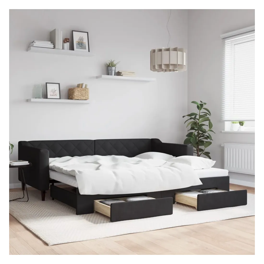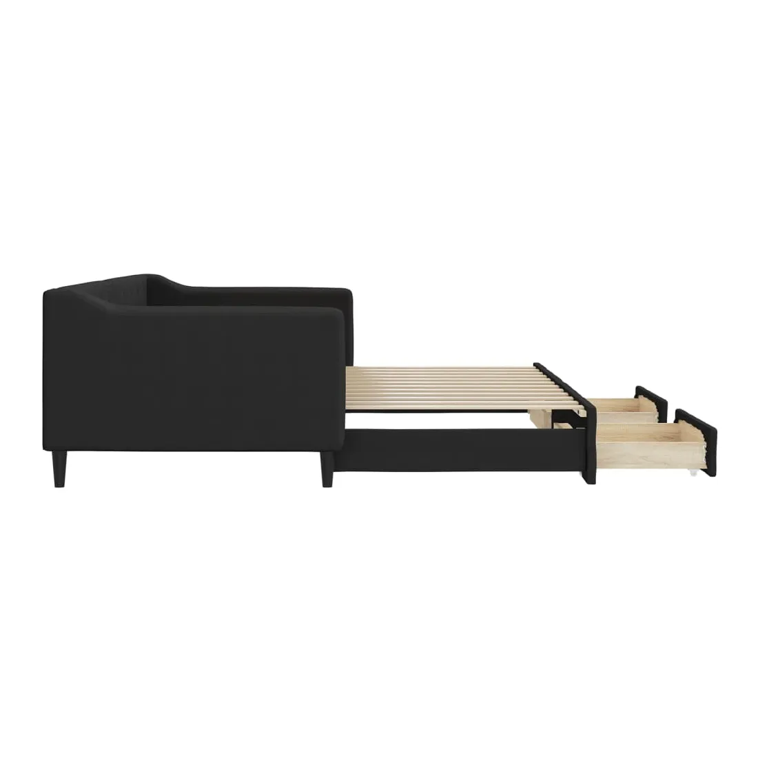 Ce lit de repos 2 en 1 avec lit gigogne, servant à la fois de canapé et de lit, constitue un supplément pratique et accrocheur à votre salon ou chambre à coucher. Lit de repos polyvalent : le canapé-lit fonctionne comme un canapé pendant la journée et se transforme facilement en lit double la nuit en retirant le lit gigogne, offrant une solution pratique pour accueillir des invités et maximiser l'espace. Grand espace de rangement : ce lit d'appoint dispose de deux tiroirs à roulettes qui offrent suffisamment d'espace pour ranger vos vêtements, chaussettes, jouets, coussins, etc. Tissu durable et construction solide : ce canapé-lit a une structure robuste en bois et en métal et est recouvert d'un tissu durable et confortable.Design moderne : le canapé-lit a un design moderne qui présente des lignes épurées, un aspect minimaliste, et ajoutera un style moderne à votre intérieur ! Bon à savoir :Les matelas ne sont pas inclus avec ce lit. Nous proposons une sélection variée de matelas. Vous pouvez consulter notre boutique pour trouver les matelas assortis.
