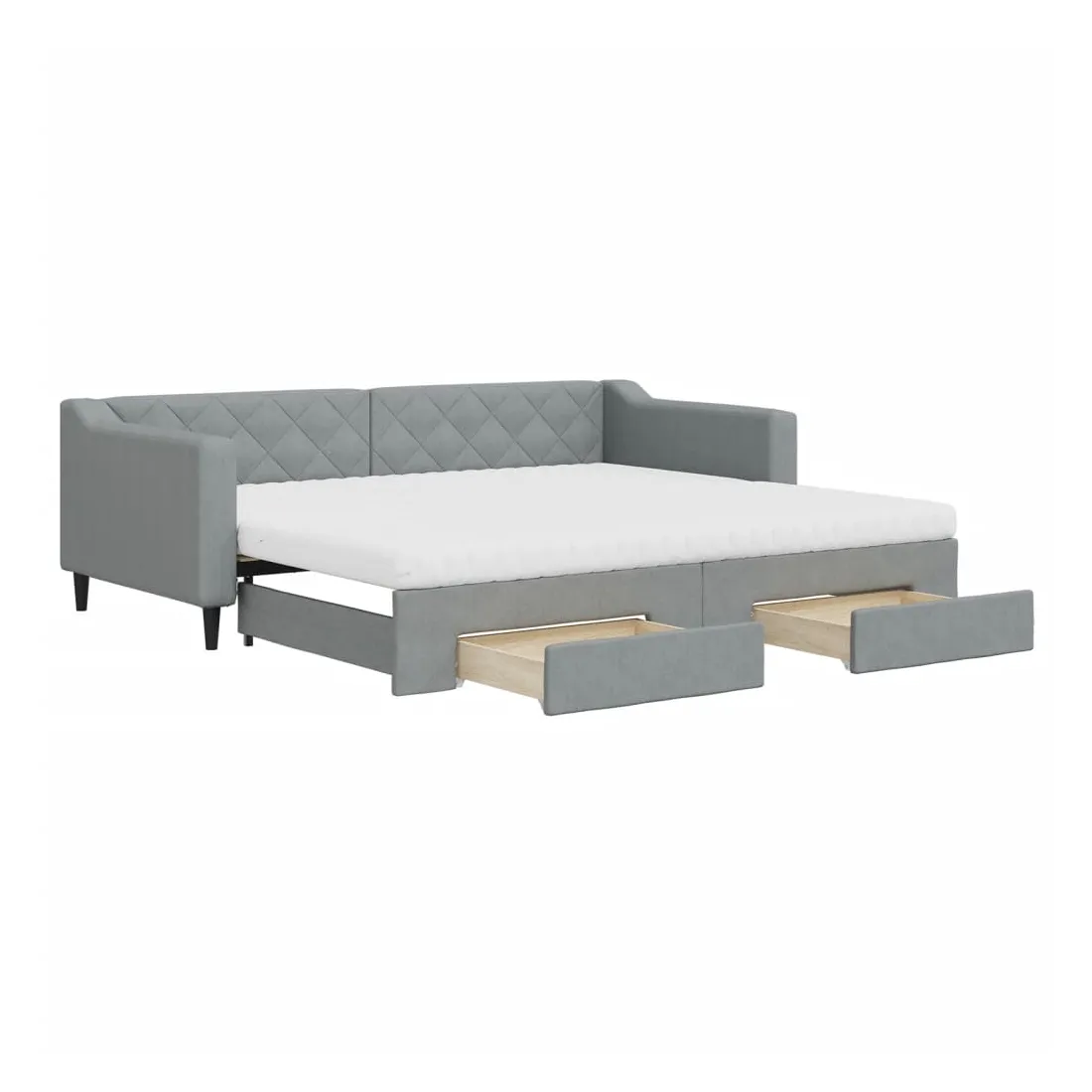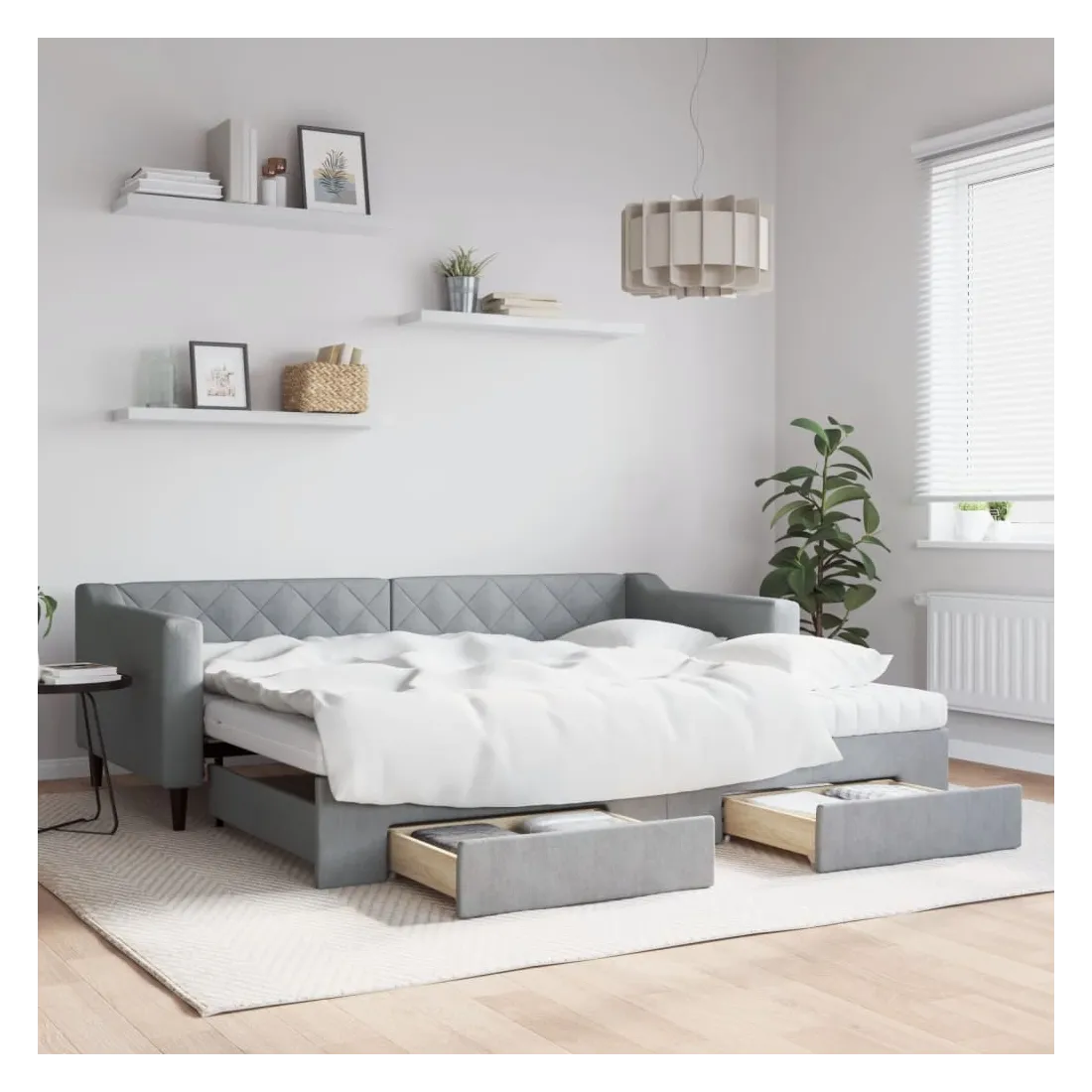 Ce lit de repos 2 en 1 avec lit gigogne, servant à la fois de canapé et de lit, constitue un supplément pratique et accrocheur à votre salon ou chambre à coucher. Lit de repos polyvalent : le canapé-lit fonctionne comme un canapé pendant la journée et se transforme facilement en lit double la nuit en retirant le lit gigogne, offrant une solution pratique pour accueillir des invités et maximiser l'espace. Grand espace de rangement : ce lit d'appoint dispose de deux tiroirs à roulettes qui offrent suffisamment d'espace pour ranger vos vêtements, chaussettes, jouets, coussins, etc. Matelas en mousse confortable : ce lit est fourni avec deux matelas en mousse pour un soutien maximal et un confort optimal. Tissu durable et construction solide : ce canapé-lit a une structure robuste en bois et en métal et est recouvert d'un tissu durable et confortable.