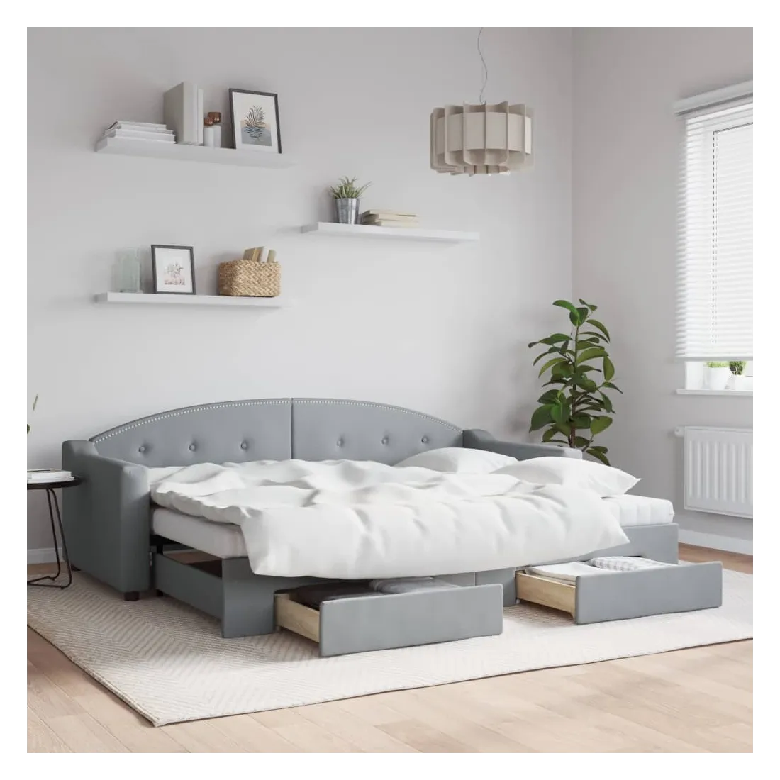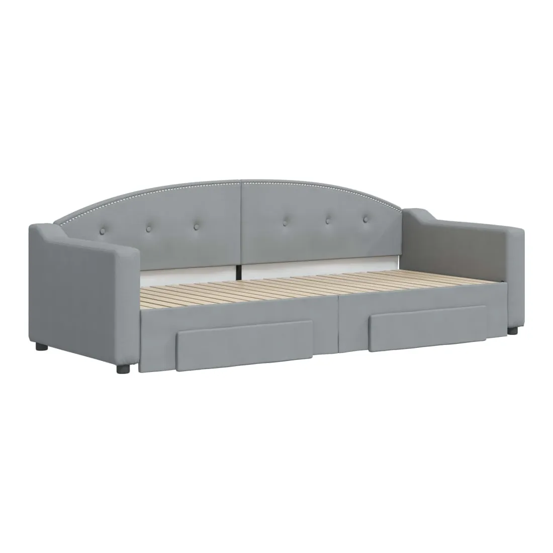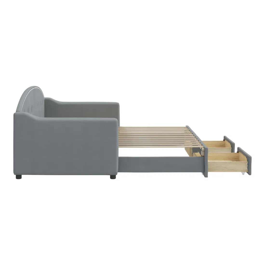 Ce lit de repos 2 en 1 avec lit gigogne, servant à la fois de canapé et de lit, constitue un supplément pratique et accrocheur à votre salon ou chambre à coucher. Lit de repos polyvalent : le canapé-lit fonctionne comme un canapé pendant la journée et se transforme facilement en lit double la nuit en retirant le lit gigogne, offrant une solution pratique pour accueillir des invités et maximiser l'espace. Grand espace de rangement : ce lit d'appoint dispose de deux tiroirs à roulettes qui offrent suffisamment d'espace pour ranger vos vêtements, chaussettes, jouets, coussins, etc. Tissu durable et construction solide : ce canapé-lit a une structure robuste en bois et en métal et est recouvert d'un tissu durable et confortable. Bon à savoir :Les matelas ne sont pas inclus avec ce lit de repos. Nous proposons une sélection variée de matelas. Vous pouvez consulter notre boutique pour les matelas assortis.