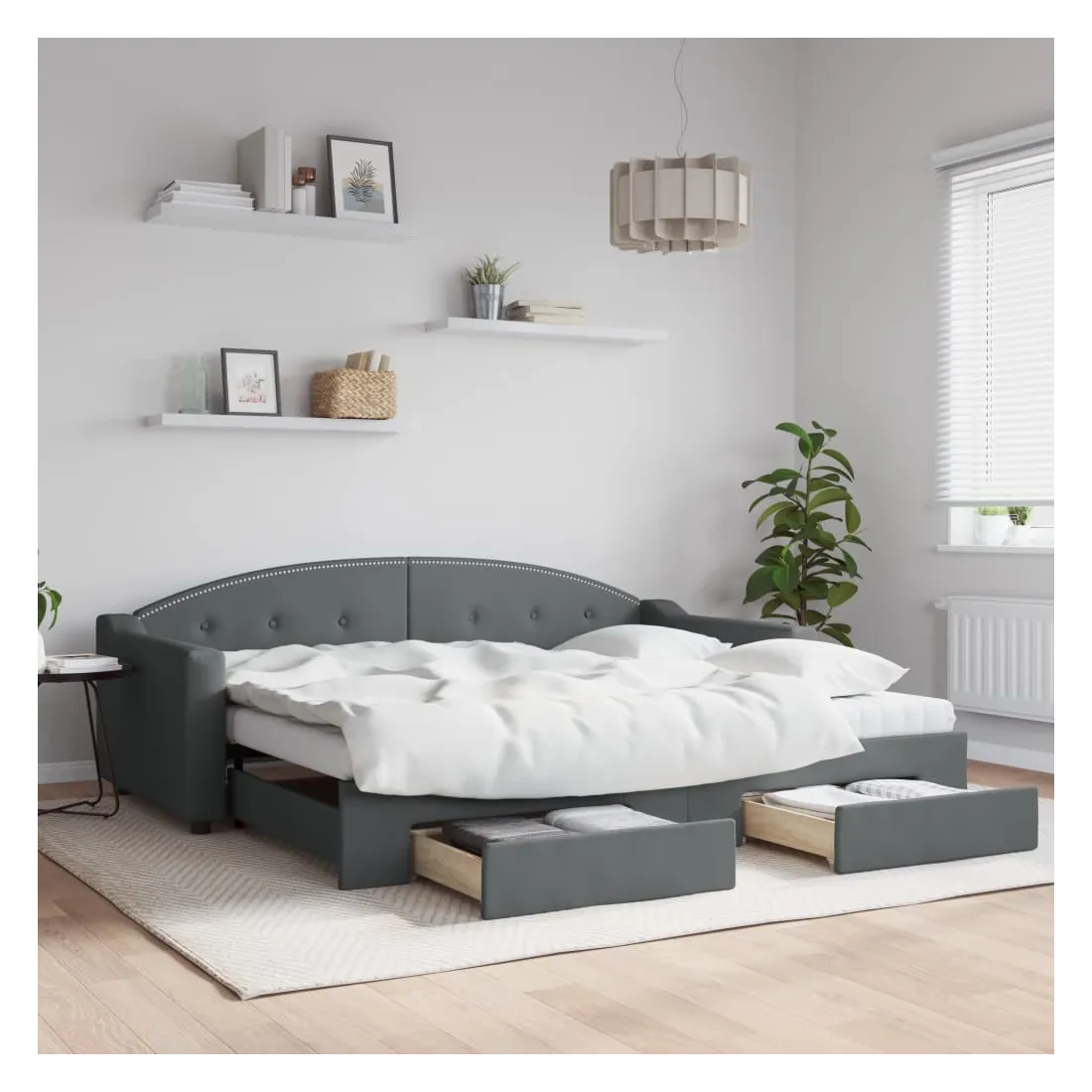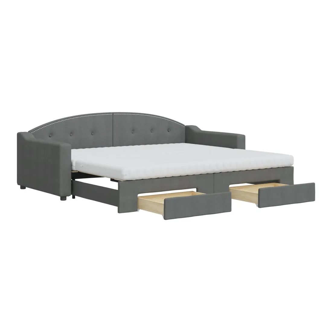 Ce lit de repos 2 en 1 avec lit gigogne, servant à la fois de canapé et de lit, constitue un supplément pratique et accrocheur à votre salon ou chambre à coucher. Lit de repos polyvalent : le canapé-lit fonctionne comme un canapé pendant la journée et se transforme facilement en lit double la nuit en retirant le lit gigogne, offrant une solution pratique pour accueillir des invités et maximiser l'espace. Grand espace de rangement : ce lit d'appoint dispose de deux tiroirs à roulettes qui offrent suffisamment d'espace pour ranger vos vêtements, chaussettes, jouets, coussins, etc. Matelas en mousse confortable : ce lit est fourni avec deux matelas en mousse pour un soutien maximal et un confort optimal. Tissu durable et construction solide : ce canapé-lit a une structure robuste en bois et en métal et est recouvert d'un tissu durable et confortable.
