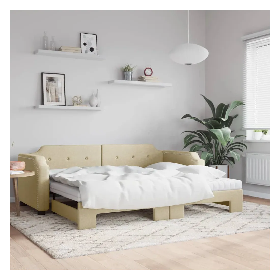 Ce lit de repos 2 en 1 avec lit gigogne, servant à la fois de canapé et de lit, constitue un supplément pratique et accrocheur à votre salon ou chambre à coucher. Lit de repos polyvalent : le canapé-lit fonctionne comme un canapé pendant la journée et se transforme facilement en lit double la nuit en retirant le lit gigogne, offrant une solution pratique pour accueillir des invités et maximiser l'espace. Matelas en mousse confortable : ce lit est fourni avec deux matelas en mousse pour un soutien maximal et un confort optimal. Tissu durable et construction solide : ce canapé-lit a une structure robuste en bois et en métal et est recouvert d'un tissu durable et confortable.