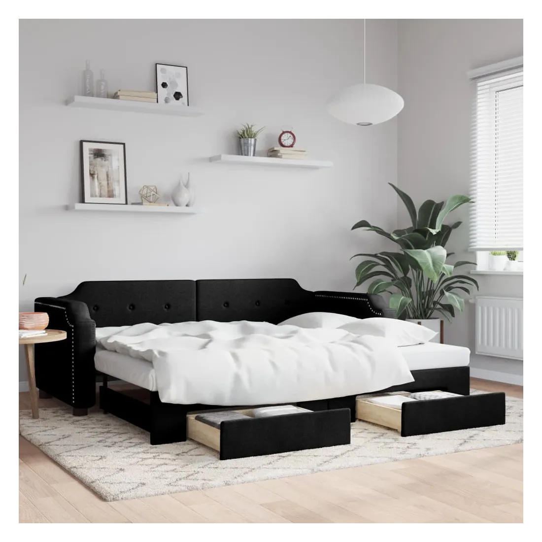 Ce lit de repos 2 en 1 avec lit gigogne, servant à la fois de canapé et de lit, constitue un supplément pratique et accrocheur à votre salon ou chambre à coucher. Lit de repos polyvalent : le canapé-lit fonctionne comme un canapé pendant la journée et se transforme facilement en lit double la nuit en retirant le lit gigogne, offrant une solution pratique pour accueillir des invités et maximiser l'espace. Grand espace de rangement : ce lit d'appoint dispose de deux tiroirs à roulettes qui offrent suffisamment d'espace pour ranger vos vêtements, chaussettes, jouets, coussins, etc. Tissu durable et construction solide : ce canapé-lit a une structure robuste en bois et en métal et est recouvert d'un tissu durable et confortable. Bon à savoir :Les matelas ne sont pas inclus avec ce lit de repos. Nous proposons une sélection variée de matelas. Vous pouvez consulter notre boutique pour les matelas assortis.
