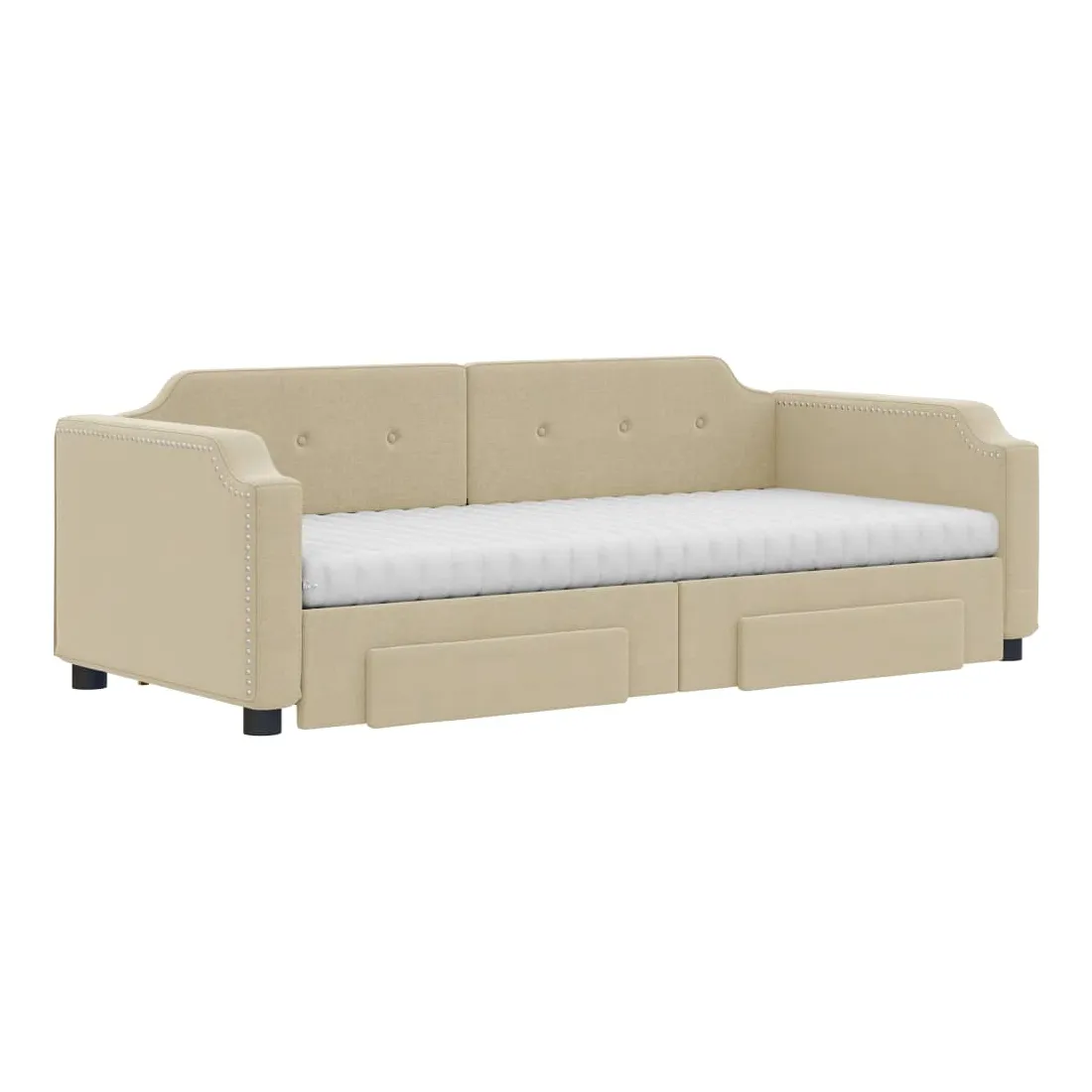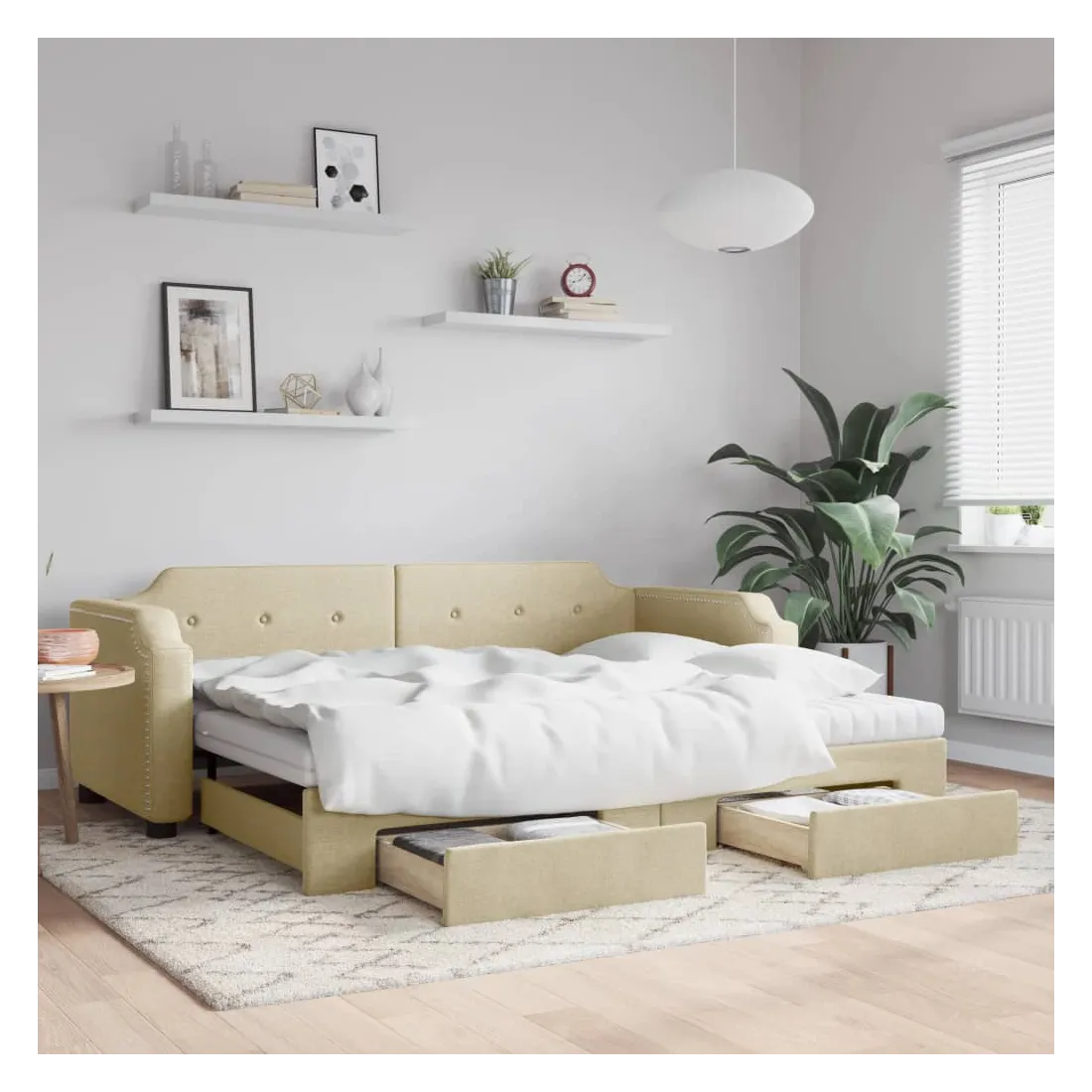 Ce lit de repos 2 en 1 avec lit gigogne, servant à la fois de canapé et de lit, constitue un supplément pratique et accrocheur à votre salon ou chambre à coucher. Lit de repos polyvalent : le canapé-lit fonctionne comme un canapé pendant la journée et se transforme facilement en lit double la nuit en retirant le lit gigogne, offrant une solution pratique pour accueillir des invités et maximiser l'espace. Grand espace de rangement : ce lit d'appoint dispose de deux tiroirs à roulettes qui offrent suffisamment d'espace pour ranger vos vêtements, chaussettes, jouets, coussins, etc. Matelas en mousse confortable : ce lit est fourni avec deux matelas en mousse pour un soutien maximal et un confort optimal. Tissu durable et construction solide : ce canapé-lit a une structure robuste en bois et en métal et est recouvert d'un tissu durable et confortable.