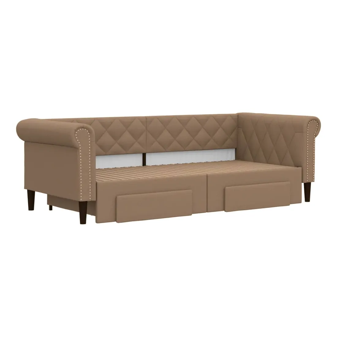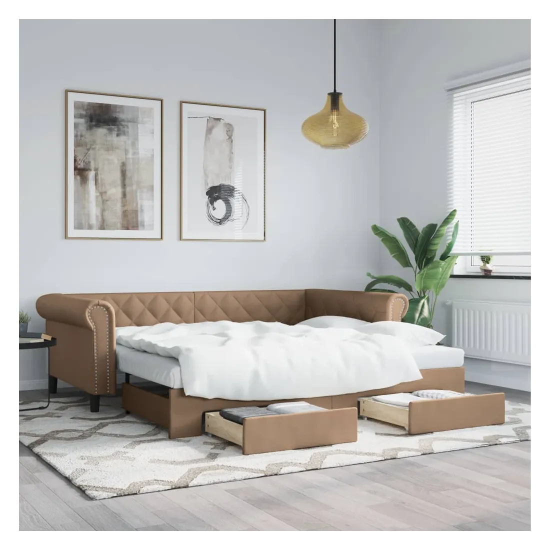 Ce lit de repos 2 en 1 avec lit gigogne, servant à la fois de canapé et de lit, constitue un supplément pratique et accrocheur à votre salon ou chambre à coucher. Lit de repos polyvalent : le canapé-lit fonctionne comme un canapé pendant la journée et se transforme facilement en lit double la nuit en retirant le lit gigogne, offrant une solution pratique pour accueillir des invités et maximiser l'espace.Grand espace de rangement : ce lit d'appoint dispose de deux tiroirs à roulettes qui offrent suffisamment d'espace pour ranger vos vêtements, chaussettes, jouets, coussins, etc.Similicuir durable et construction solide : ce canapé-lit a une structure robuste en bois et en métal et est recouvert d'un similicuir durable et facile à nettoyer.Design moderne : le canapé-lit a un design moderne qui présente des lignes épurées, un aspect minimaliste, ainsi que de la lumière naturelle, et ajoutera un style moderne à votre intérieur ! Bon à savoir :Les matelas ne sont pas inclus avec ce lit. Nous proposons une sélection variée de matelas. Vous pouvez consulter notre boutique pour trouver les matelas assortis.