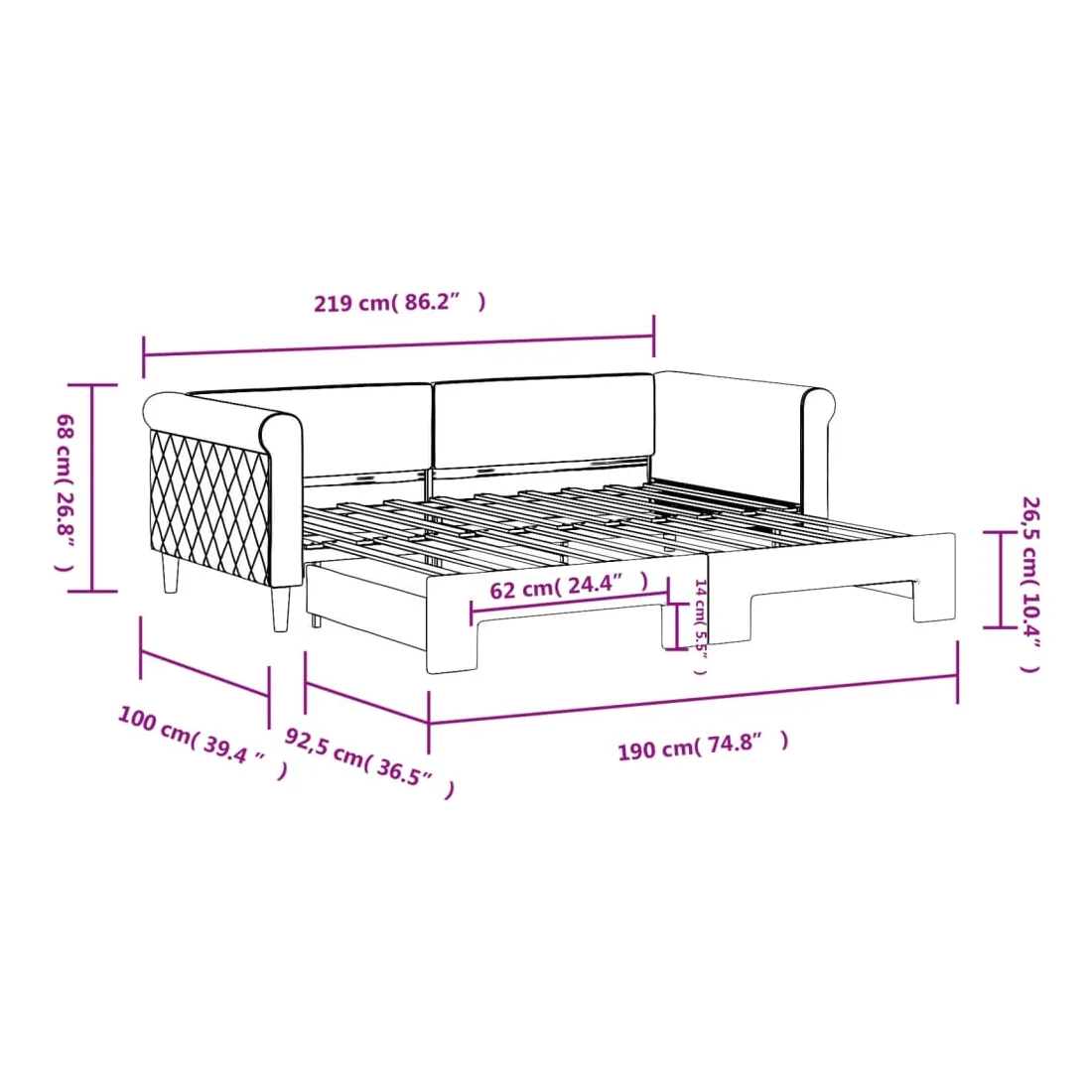 - Dimensions (non étendu) : 219 x 100 x 68 cm (L x l x H)