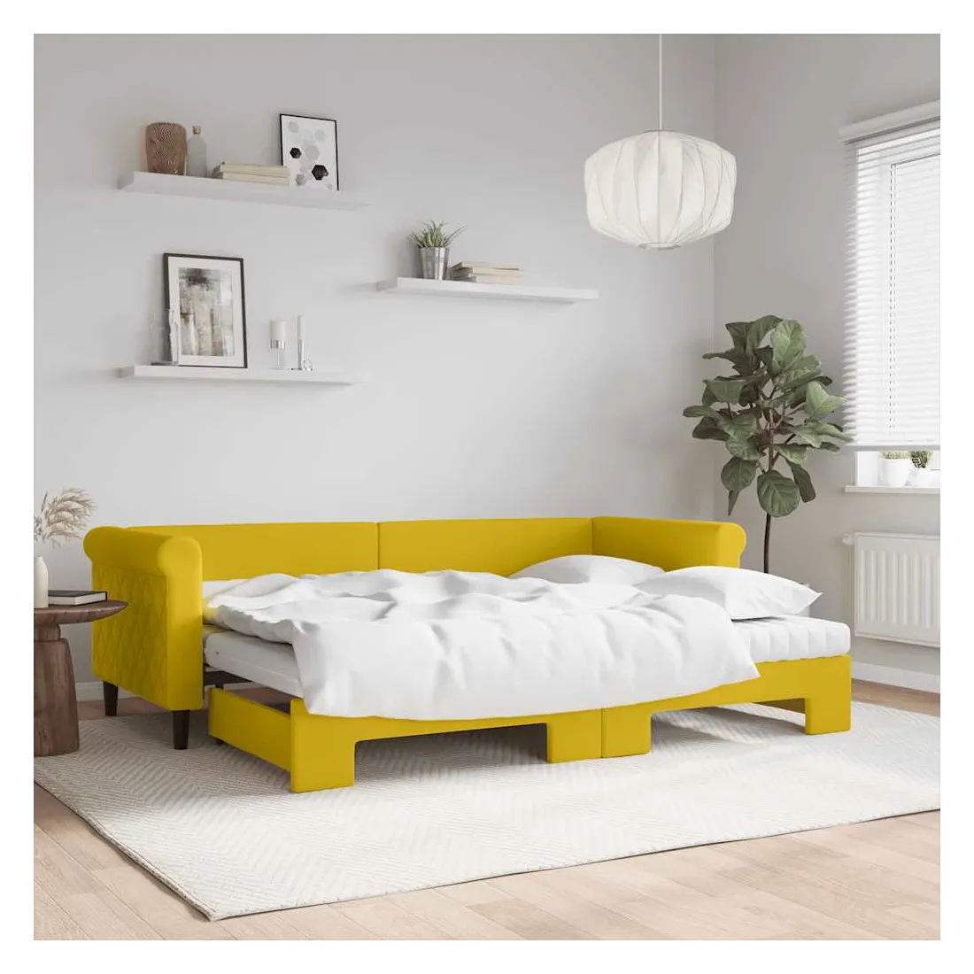Ce lit de repos 2 en 1 avec lit gigogne, servant à la fois de canapé et de lit, constitue un supplément pratique et accrocheur à votre salon ou chambre à coucher. Lit de repos polyvalent : le canapé-lit fonctionne comme un canapé pendant la journée et se transforme facilement en lit double la nuit en retirant le lit gigogne, offrant une solution pratique pour accueillir des invités et maximiser l'espace.Matelas en mousse confortable : ce lit est fourni avec deux matelas en mousse pour un soutien maximal et un confort optimal.Velours doux et construction solide : ce canapé-lit a un cadre robuste en bois et en métal et est recouvert de velours doux et confortable.Design moderne : le canapé-lit a un design moderne qui présente des lignes épurées, un aspect minimaliste, ainsi que de la lumière naturelle, et ajoutera un style moderne à votre intérieur !