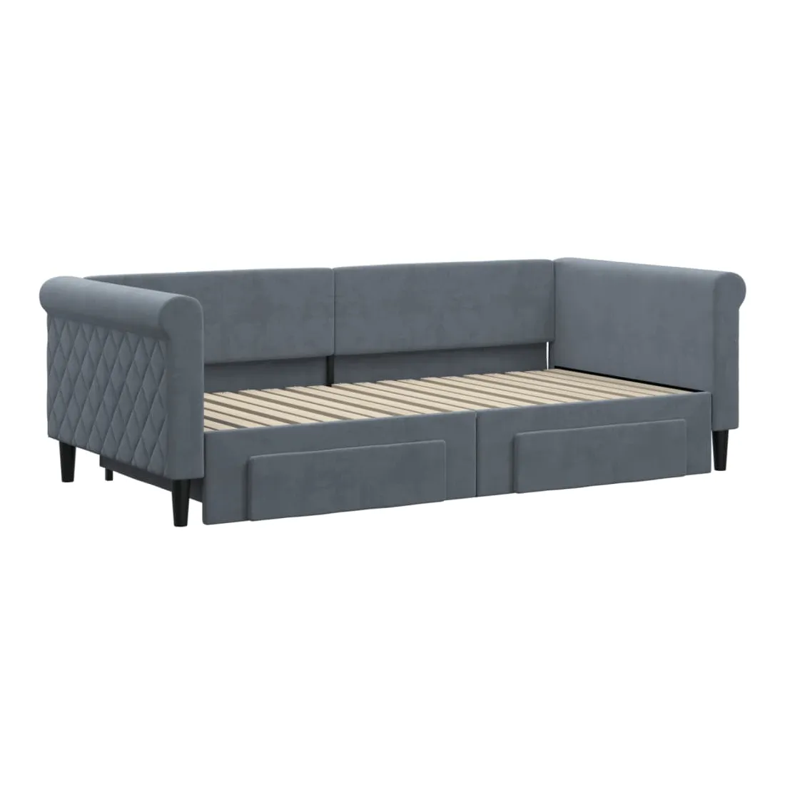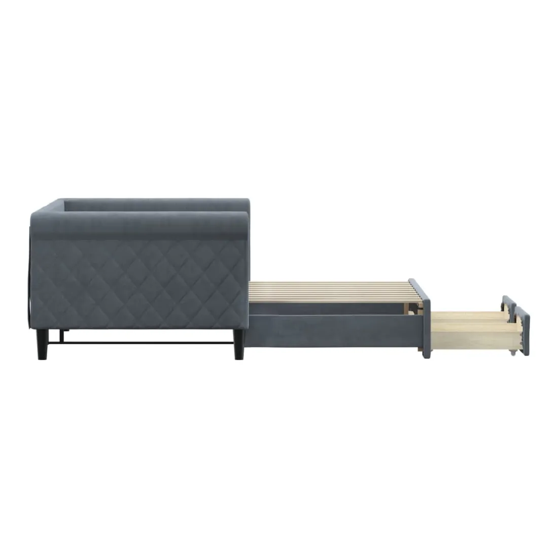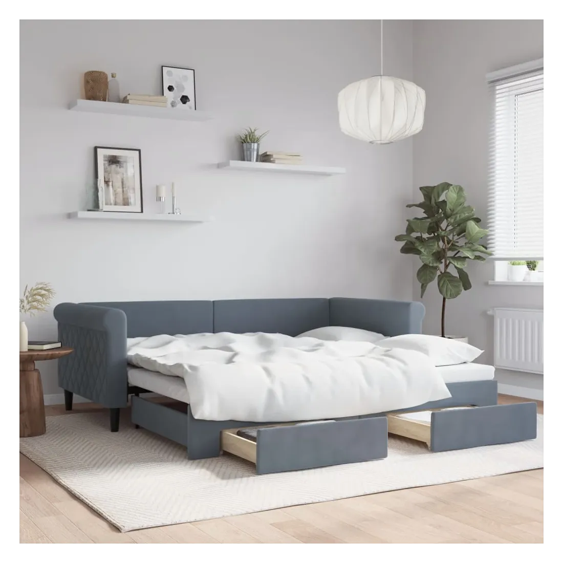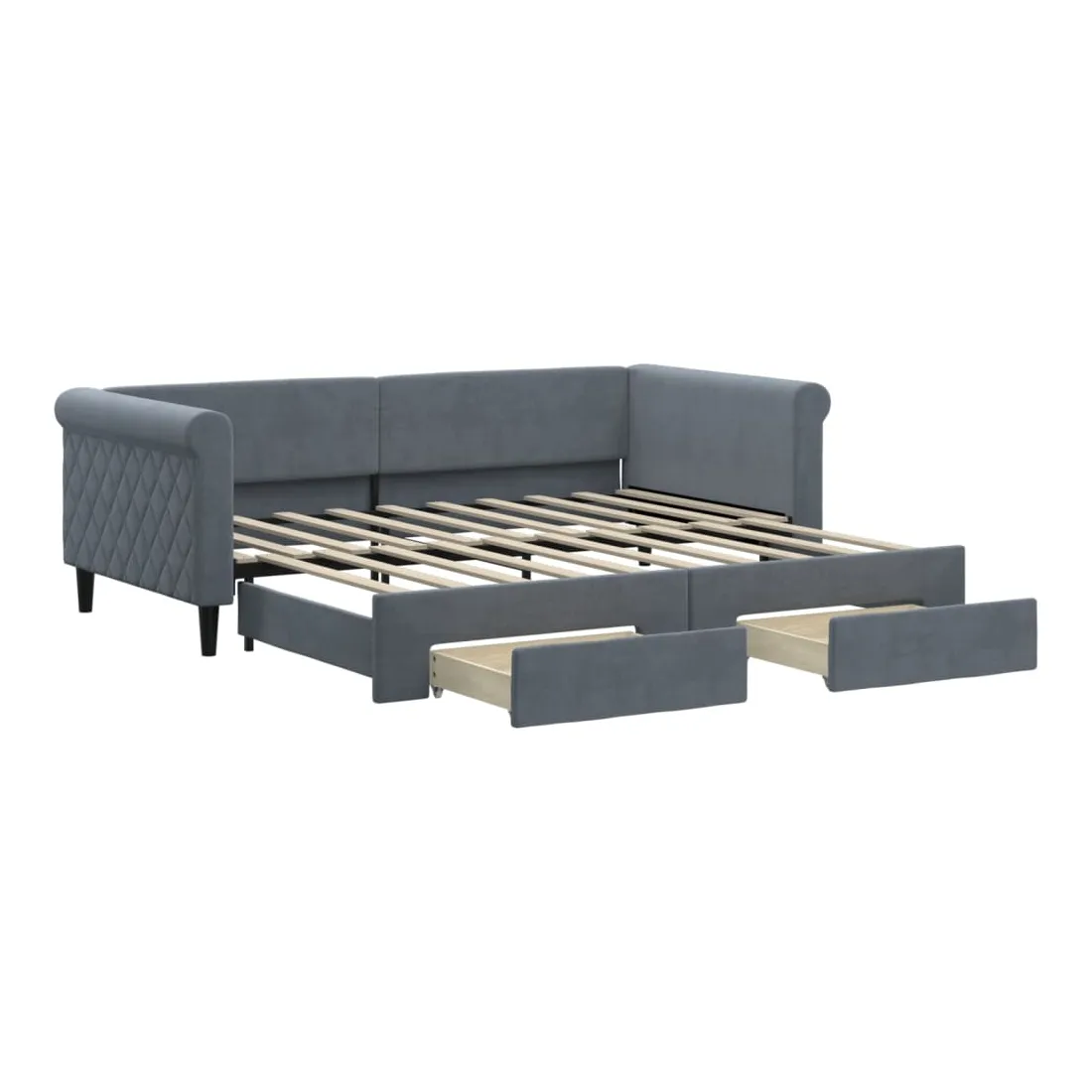 Ce lit de repos 2 en 1 avec lit gigogne, servant à la fois de canapé et de lit, constitue un supplément pratique et accrocheur à votre salon ou chambre à coucher. Lit de repos polyvalent : le canapé-lit fonctionne comme un canapé pendant la journée et se transforme facilement en lit double la nuit en retirant le lit gigogne, offrant une solution pratique pour accueillir des invités et maximiser l'espace.Grand espace de rangement : ce lit d'appoint dispose de deux tiroirs à roulettes qui offrent suffisamment d'espace pour ranger vos vêtements, chaussettes, jouets, coussins, etc.Velours doux et construction solide : ce canapé-lit a un cadre robuste en bois et en métal et est recouvert de velours doux et confortable.Design moderne : le canapé-lit a un design moderne qui présente des lignes épurées, un aspect minimaliste, ainsi que de la lumière naturelle, et ajoutera un style moderne à votre intérieur ! Bon à savoir :Les matelas ne sont pas inclus avec ce lit. Nous proposons une sélection variée de matelas. Vous pouvez consulter notre boutique pour trouver les matelas assortis.