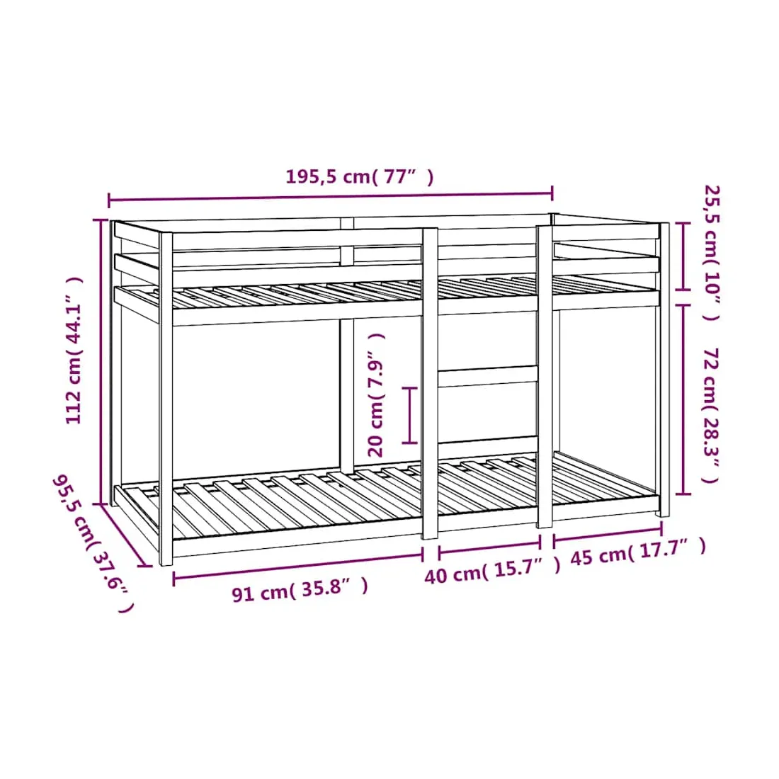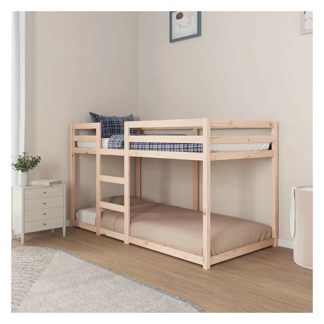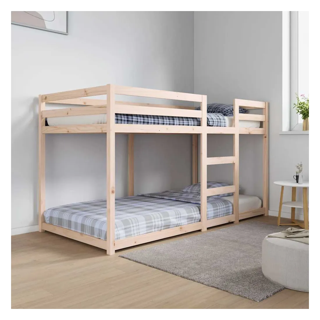 Ce lit superposé en bois est élégant et fonctionnel, ce qui en fait un supplément parfait à toute pièce dont l'espace est limité. Bois de pin massif : le bois de pin massif est un matériau naturel magnifique. Le bois de pin a un grain droit et les nœuds donnent au matériau son aspect caractéristique et rustique.Design sûr : le lit surélevé est conçu dans un souci de sécurité. Il comprend des garde-corps qui empêchent l'utilisateur de rouler pendant son sommeil.Convient aux espaces limités : le cadre de lit est un excellent choix pour toute pièce dont l'espace est limité, il fournit deux lits individuels avec un design compact. Bon à savoir :La livraison comprend uniquement un cadre de lit. Le matelas n'est pas inclus. Vous pouvez consulter notre boutique pour trouver les matelas assortis.