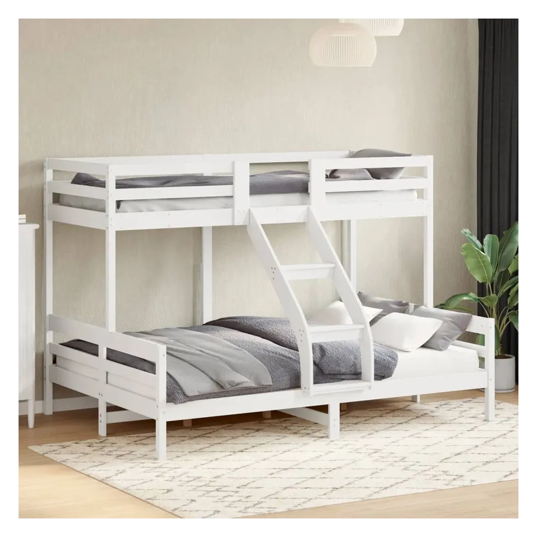 Ce lit superposé en bois est élégant et fonctionnel, ce qui en fait un supplément parfait à toute pièce dont l'espace est limité. Bois de pin massif : le bois de pin massif est un matériau naturel magnifique. Le bois de pin a un grain droit et les nœuds donnent au matériau son aspect caractéristique et rustique.Design sûr : le lit surélevé est conçu dans un souci de sécurité. Il comprend des garde-corps qui empêchent l'utilisateur de rouler pendant son sommeil.Convient aux espaces limités : le cadre de lit est un excellent choix pour toute pièce dont l'espace est limité, il fournit deux lits individuels avec un design compact. Bon à savoir :La livraison comprend uniquement un cadre de lit. Le matelas n'est pas inclus. Vous pouvez consulter notre boutique pour trouver les matelas assortis.