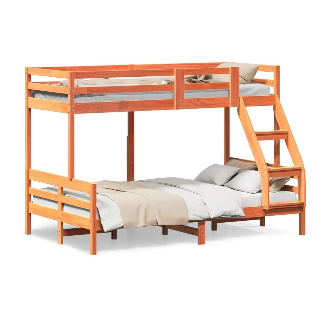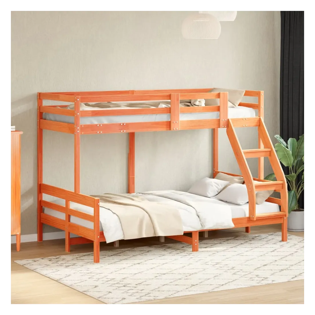 Ce lit superposé en bois est élégant et fonctionnel, ce qui en fait un supplément parfait à toute pièce dont l'espace est limité. Bois de pin massif : le bois de pin massif est un matériau naturel magnifique. Le bois de pin a un grain droit et les nœuds donnent au matériau son aspect caractéristique et rustique.Design sûr : le lit surélevé est conçu dans un souci de sécurité. Il comprend des garde-corps qui empêchent l'utilisateur de rouler pendant son sommeil.Convient aux espaces limités : le cadre de lit est un excellent choix pour toute pièce dont l'espace est limité, il fournit deux lits individuels avec un design compact. Bon à savoir :La livraison comprend uniquement un cadre de lit. Le matelas n'est pas inclus. Vous pouvez consulter notre boutique pour trouver les matelas assortis.